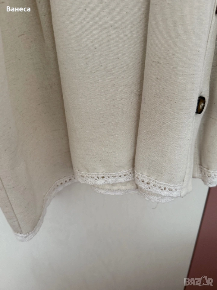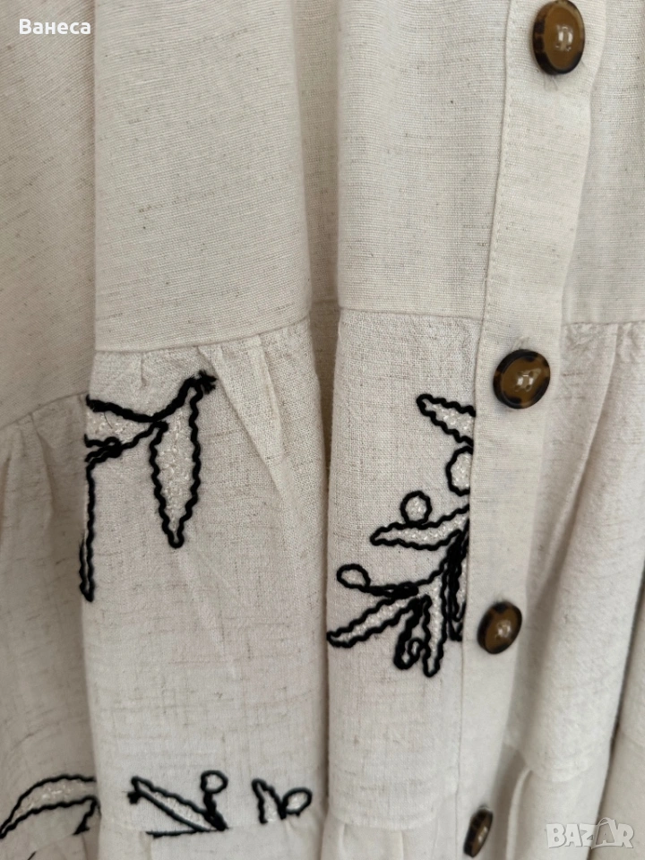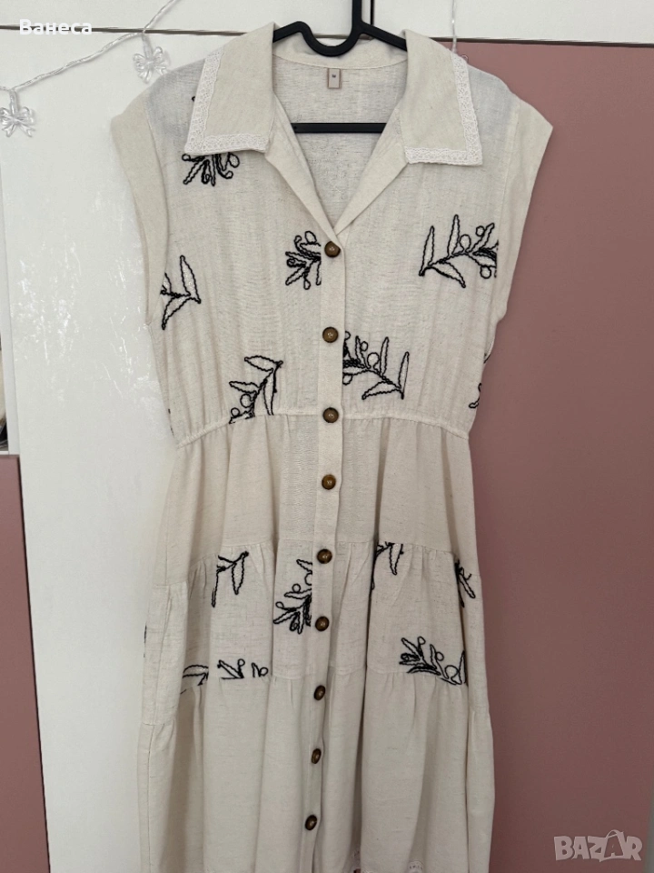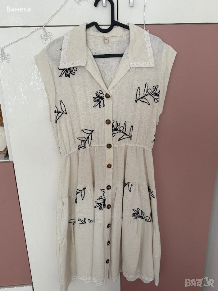 Роклята е нова-не е обличана, не е прана.Свалила съм етикета.Материята е лен, памук и 20% вискоза , за да не се мачка.