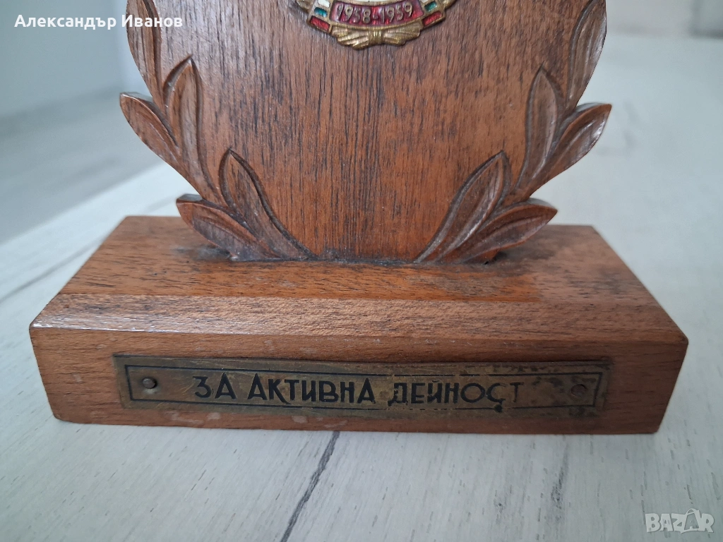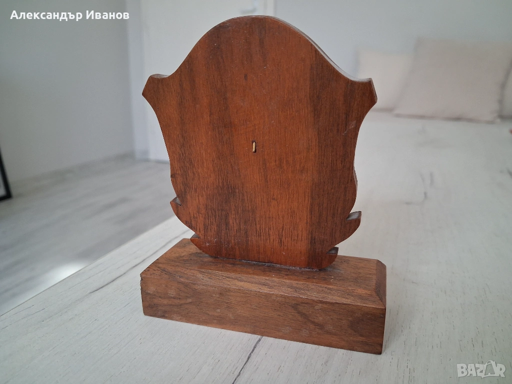 На дървена основа са разположени метални плакет и надпис.Размери на основата 10/4 см.,височина 12 см.