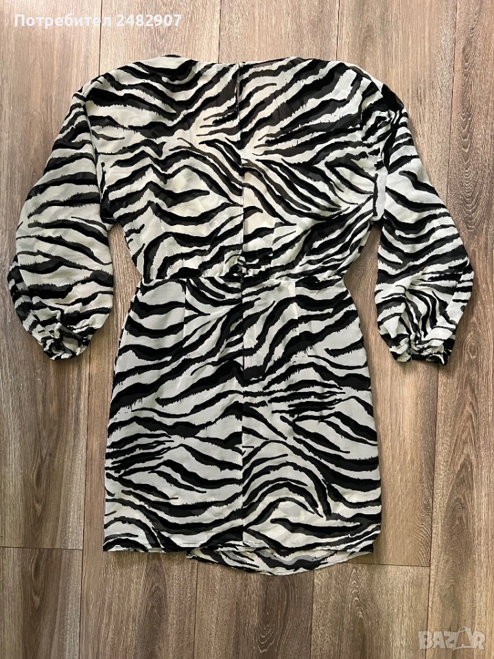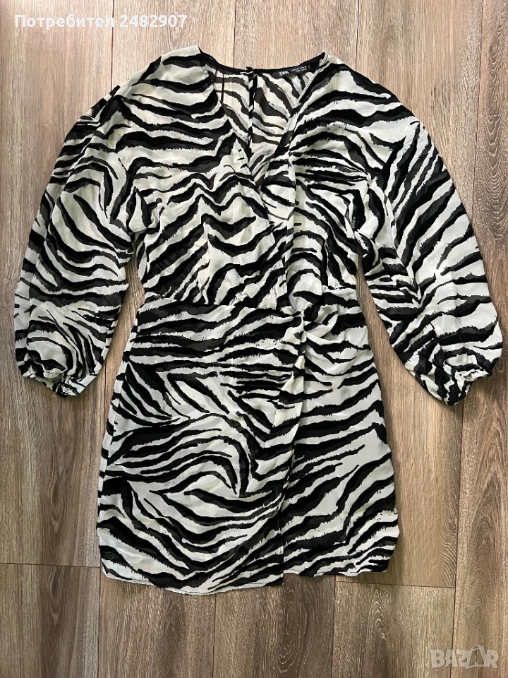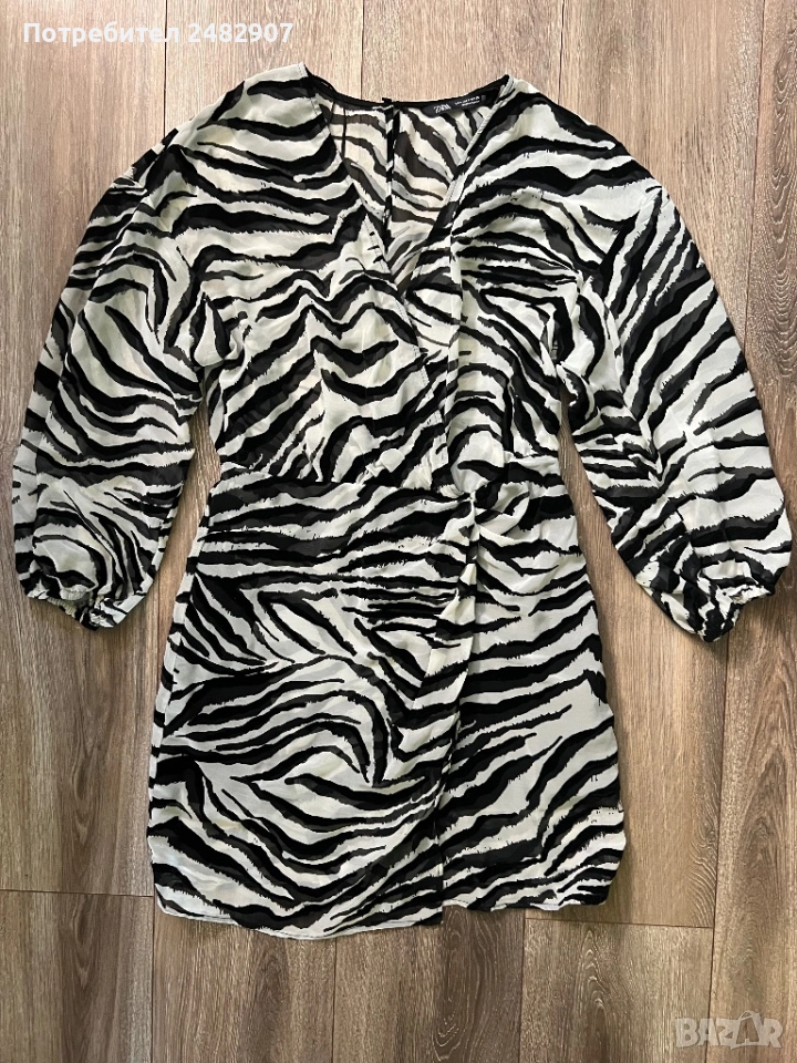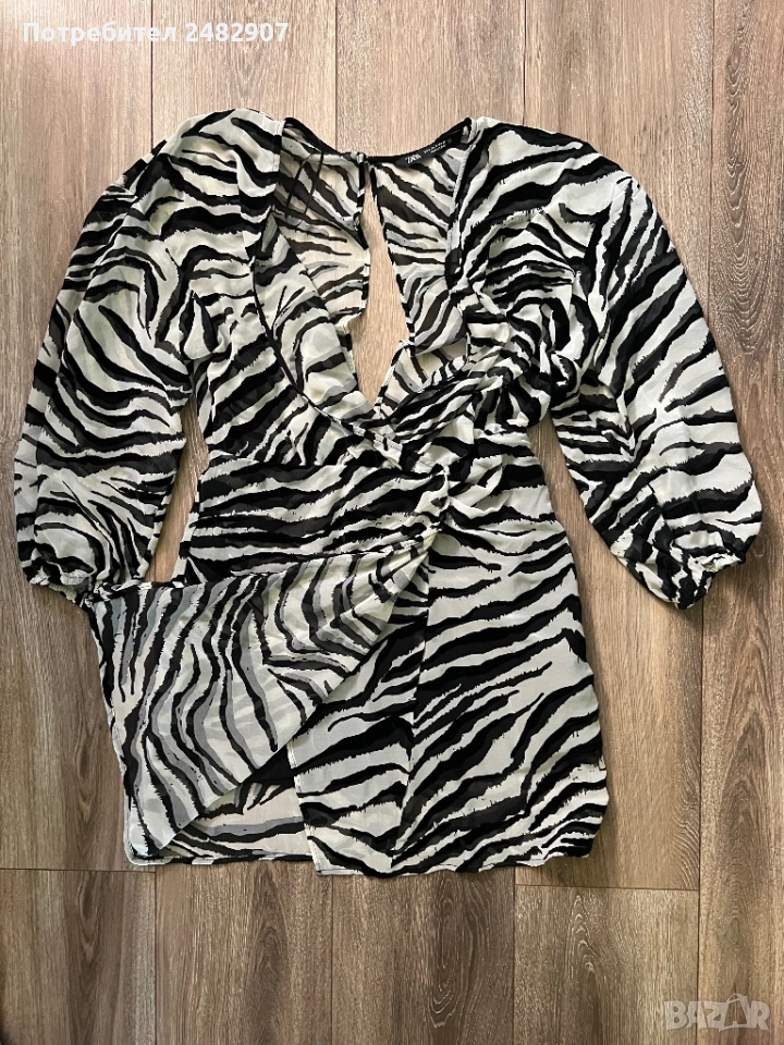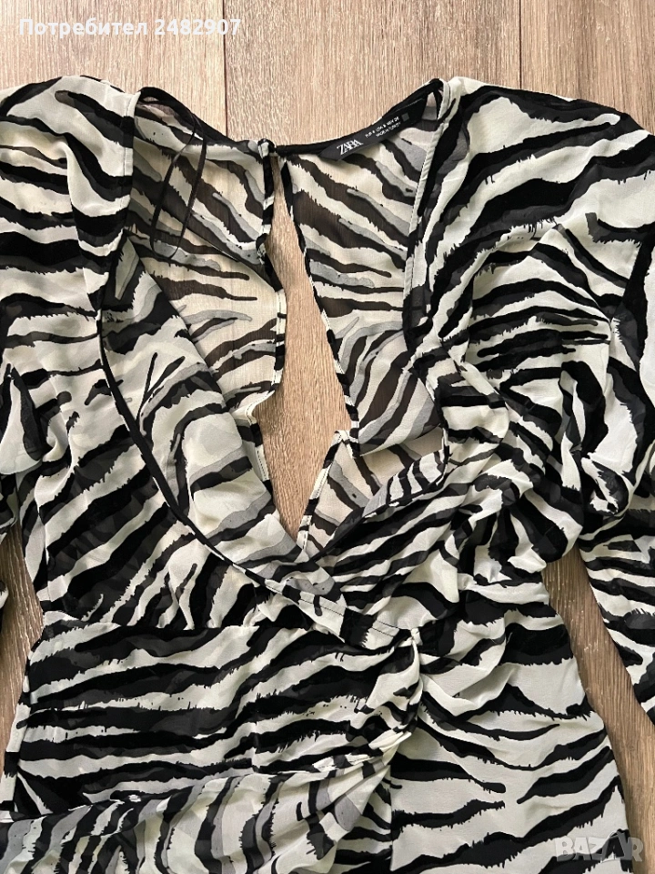 Ефектна дамска рокля ZARA, размер S. Съдържа 100 % полиестер. Ширина в раменете - 54 см, ширина под мишниците - 46 см, ширина в талията - 36 см, ширина в долната част - 49 см, дължина от рамото до долу - 89 см, дължина на ръкава от рамото - 42 см, ширина на ръкава в долната част - 11 см. Много запазена, обличана веднъж за повод, полупрозрачна, с подплата в долната част, отворен гръб и огромно деколте.