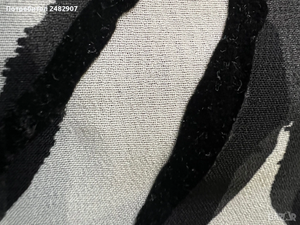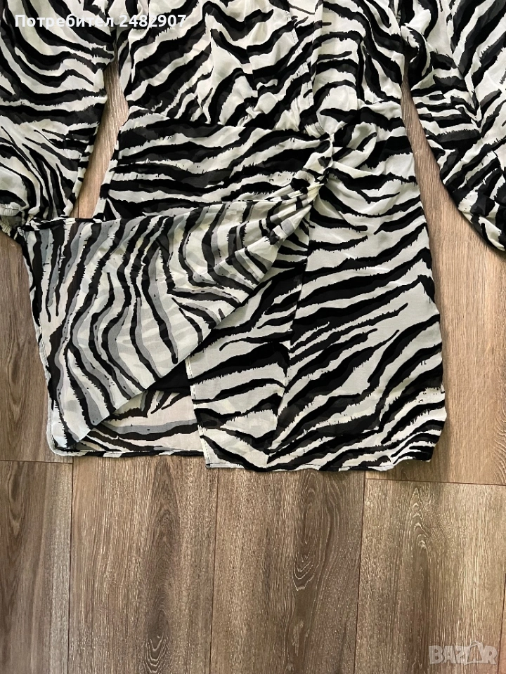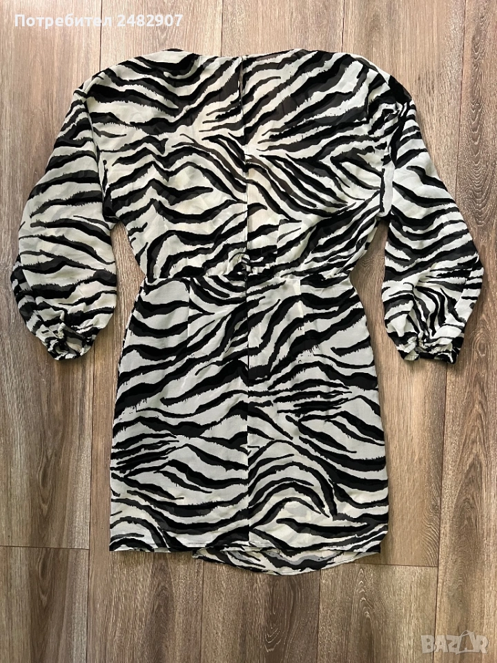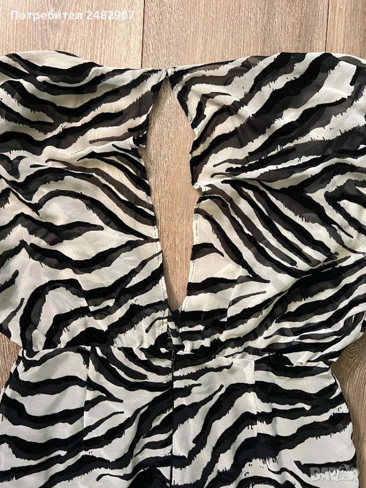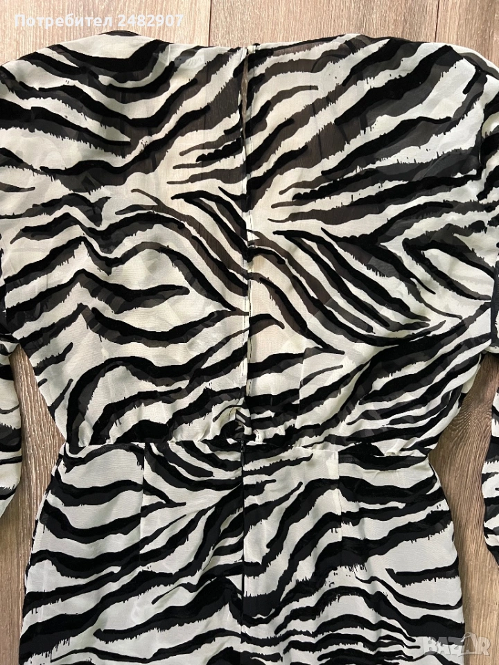Ефектна дамска рокля ZARA, размер S. Съдържа 100 % полиестер. Ширина в раменете - 54 см, ширина под мишниците - 46 см, ширина в талията - 36 см, ширина в долната част - 49 см, дължина от рамото до долу - 89 см, дължина на ръкава от рамото - 42 см, ширина на ръкава в долната част - 11 см. Много запазена, обличана веднъж за повод, полупрозрачна, с подплата в долната част, отворен гръб и огромно деколте.