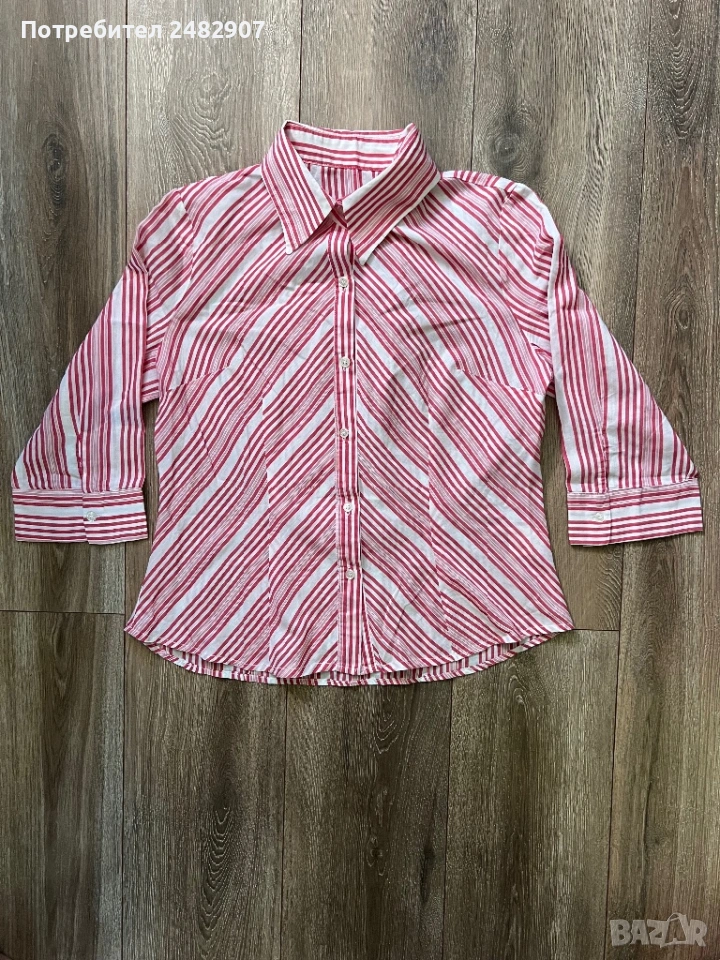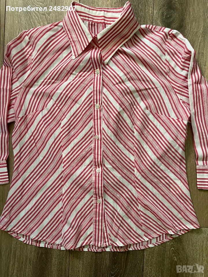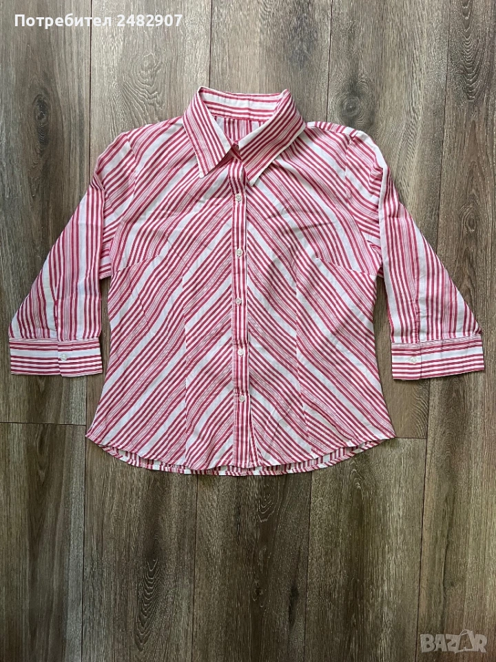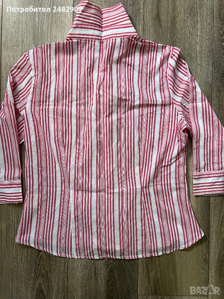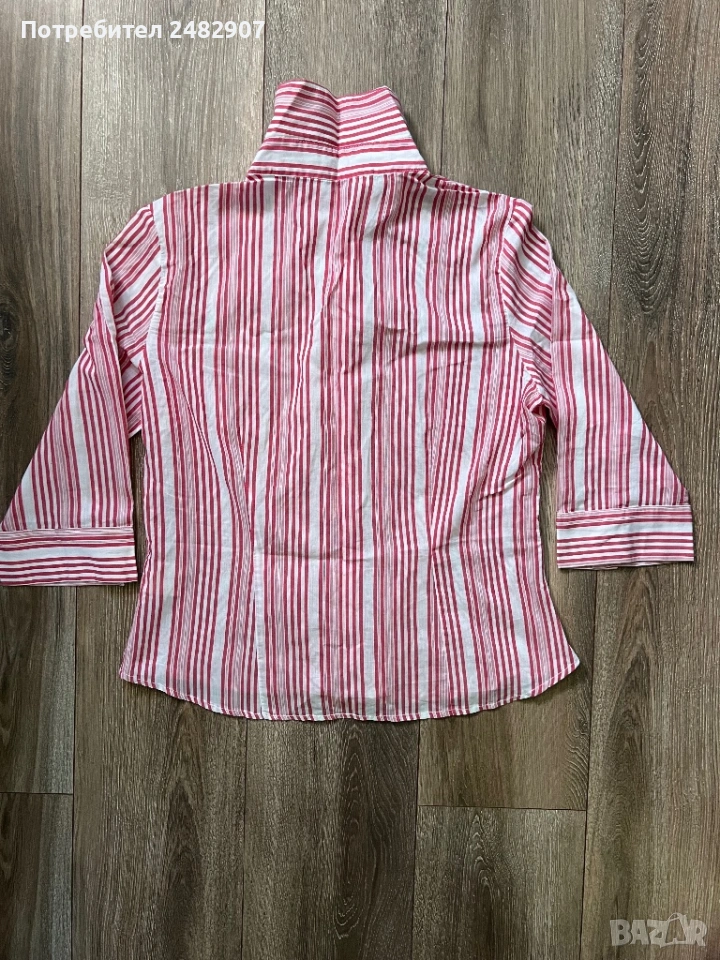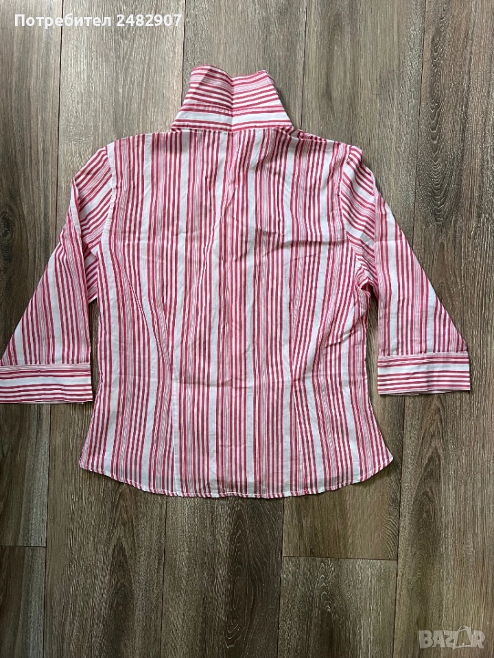 Дамска риза в бяло и червено, размер 46. Съдържа 100 % памук. Ширина в раменете - 40 см, ширина под мишниците - 51 см, ширина в долната част - 54 см, дължина от рамото до долу - 61 см, дължина на ръкава от рамото - 44 см, ширина на ръкава в долната част - 15,5 см. Много запазена.