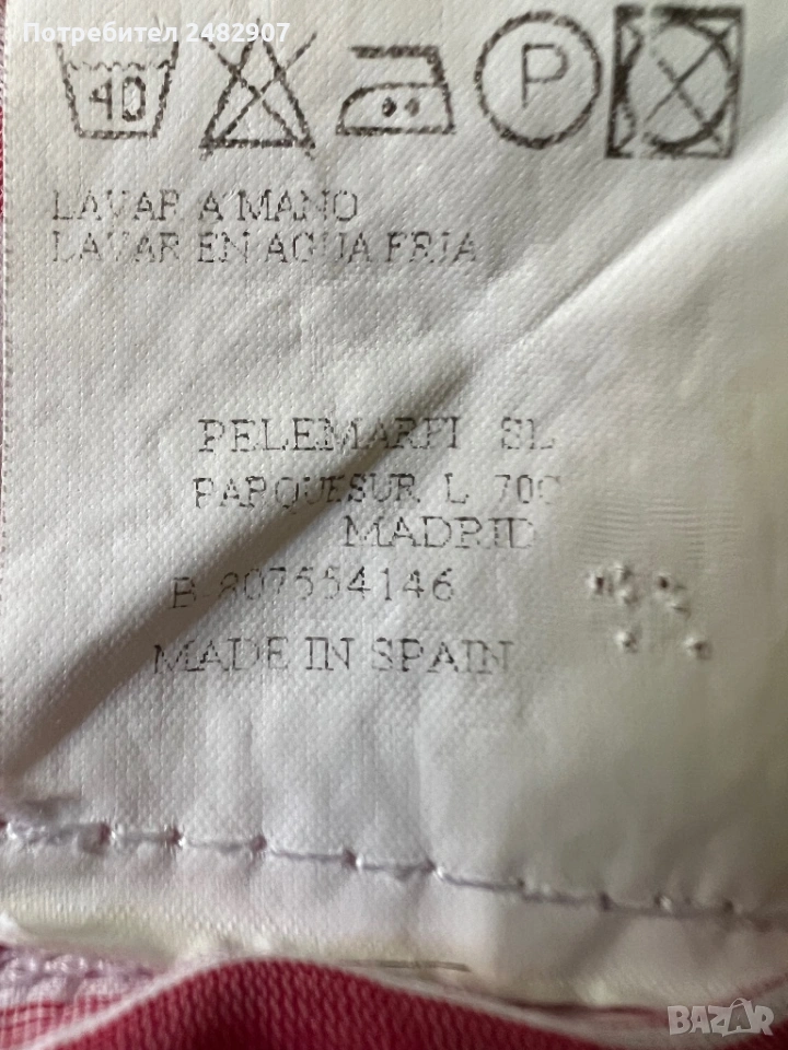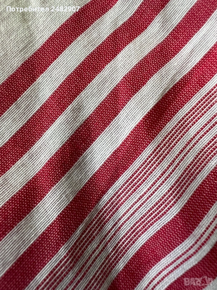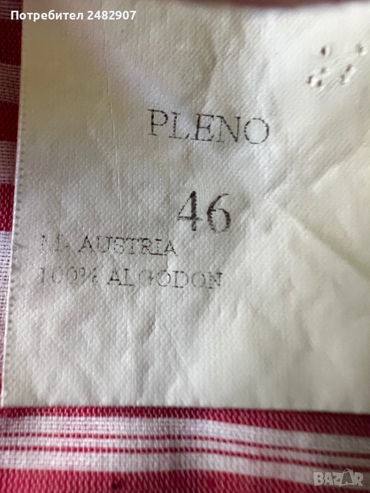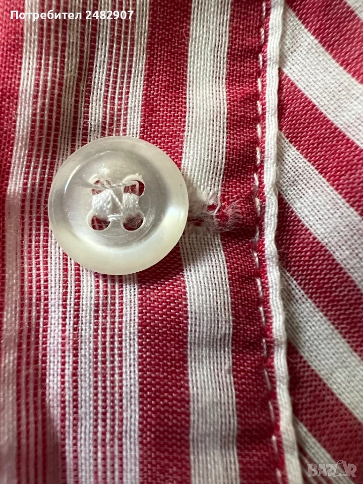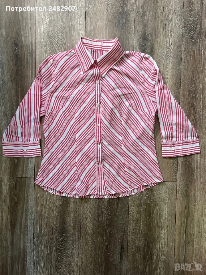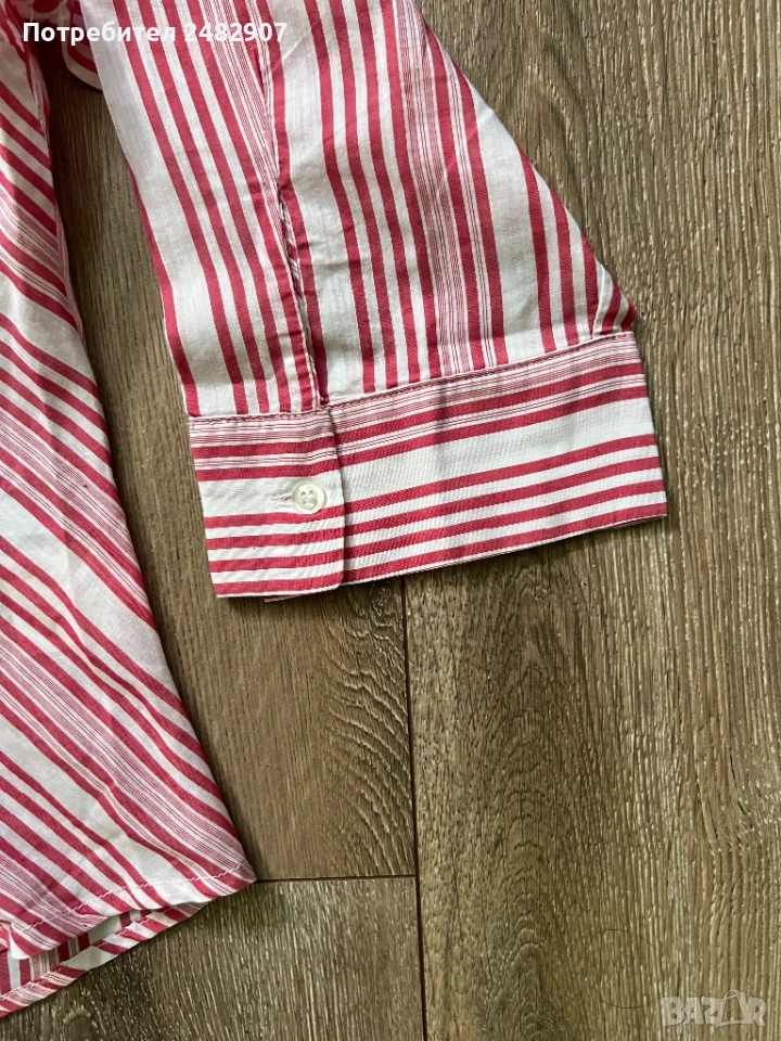 Дамска риза в бяло и червено, размер 46. Съдържа 100 % памук. Ширина в раменете - 40 см, ширина под мишниците - 51 см, ширина в долната част - 54 см, дължина от рамото до долу - 61 см, дължина на ръкава от рамото - 44 см, ширина на ръкава в долната част - 15,5 см. Много запазена.
