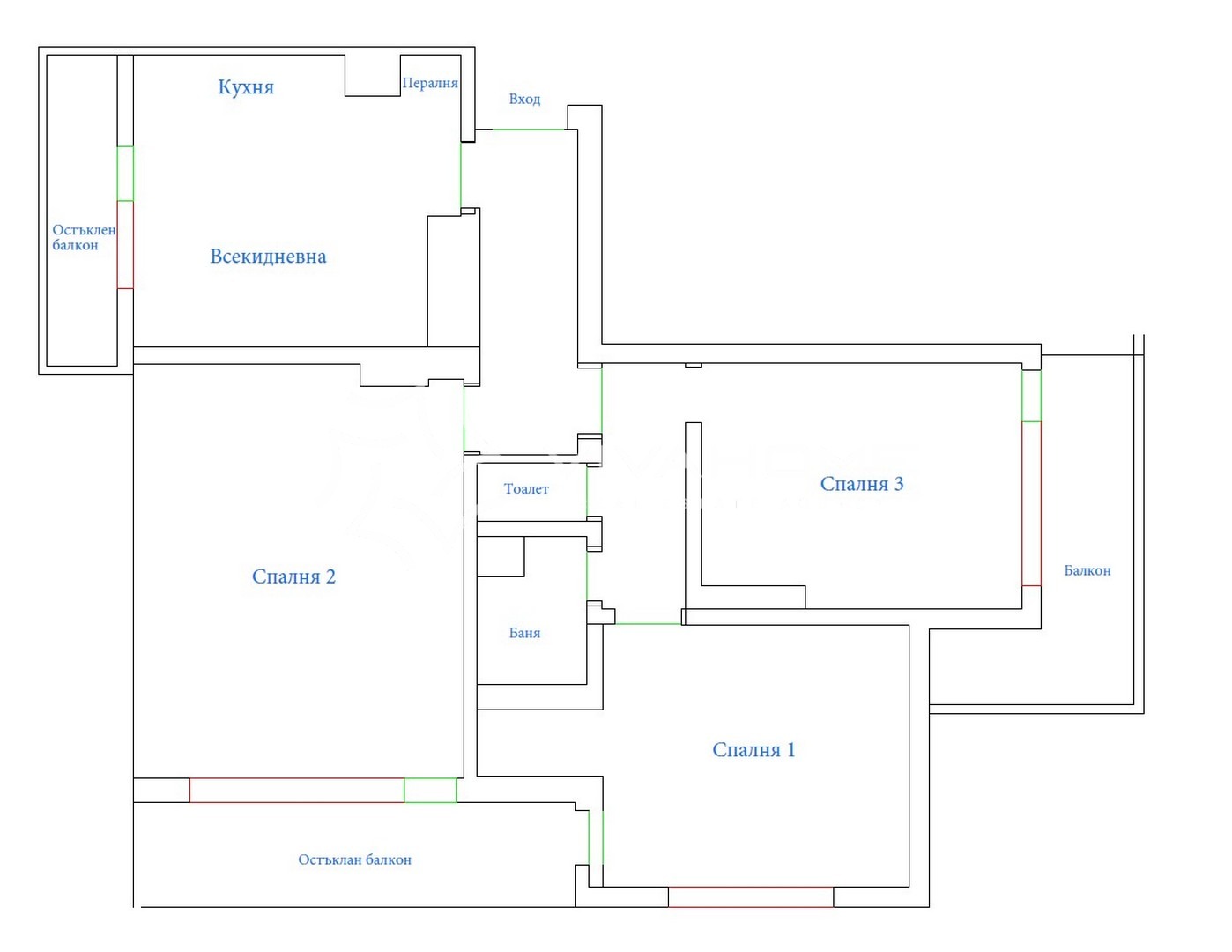 Площ 100м2, разпределени по следния начин - антре, всекидневна с кухня, 3 спални, баня/wc и 3 тераси с панорамни гледки в 3 посоки.