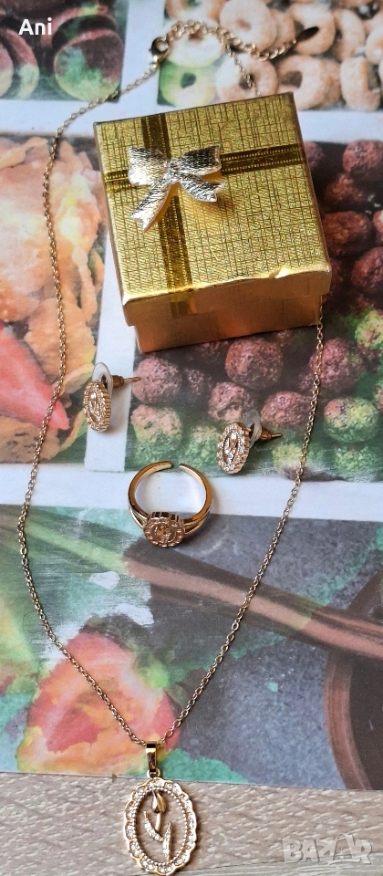 Продавам нежен позлатен комплект. С камъчета. Пръстена се регулира. Цена 12 евро. Изпращам по Еконт или Спиди за сметка на купувача. За София лично предаване.