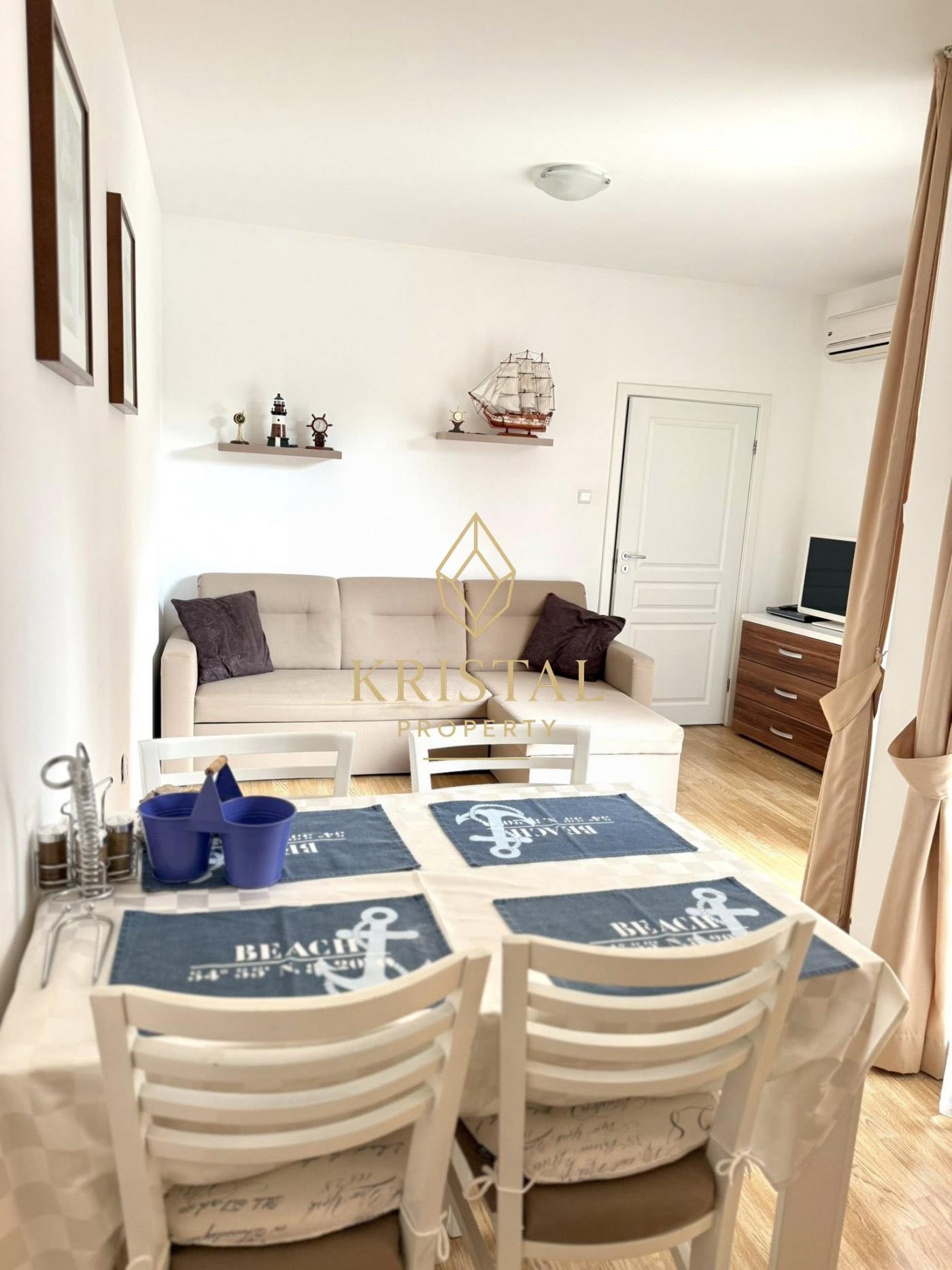 ID: 596 Предлагаме за продажба обзаведен апартамент с една спалня в престижен комплекс в Слънчев бряг. Апартаментът е готов за живеене или отдаване под наем като инвестиционен имот. Разпределението включва хол с кухня и трапезария, спалня, входно антре, баня с душ и тераса с изглед към басейна. Комплексът предлага: ограничен достъп, паркинг, спа център, ресторант, детска площадка и басейн с шезлонги. Комплексът е заобиколен от добре развита инфраструктура. Морето е само на 600 метра.
