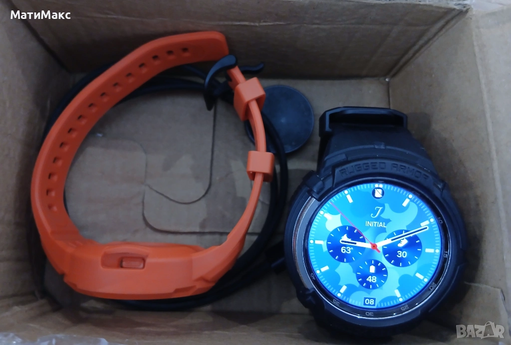 Часовникът е като нов, с Гаранция . В пълен комплект с аксесоари и зарядно само, кутията липсва. Като давам и още една верижка, като подарък към него . Изпращам го с преглед и тест , а за град Варна , може и лично предаване .