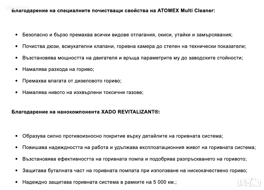 Благодарение на специалните почистващи свойства на ATOMEX Multi Cleaner: Безопасно и бързо премахва всички видове отлагания, окиси, утайки и замърсявания; Почиства дюзи, всмукателни клапани, горивна камера до степен на технически показатели; Възстановява мощността на двигателя и връща параметрите му до заводските стойности; Намалява разхода на гориво; Премахва влагата от дизеловото гориво; Намалява нивото на изхвърлени токсични газове.