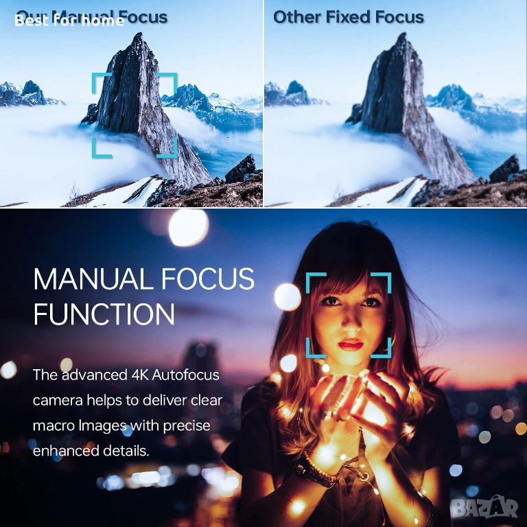 С широкоъгълен обектив и макро обектив: Оборудвана с 52 мм подвижен широкоъгълен обектив и макро обектив, тази 4K камера улавя големи хоризонти и малки детайли с лекота. Ръчното фокусиране осигурява резки снимки, а бутон отгоре улеснява превключването между режими за снимки, видео и timelapse.