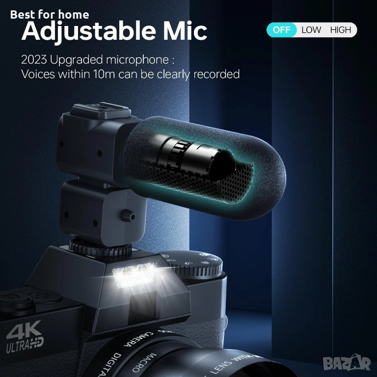 2023 Регулируем микрофон Най-новият външен стерео микрофон на тази влог камера може ефективно да елиминира шума, да подобри силата на звука и яснотата с 80%. По-стабилен, по-ясен и по-стерео звук от другите видеокамери. Преносимата камера е оборудвана със светкавица за заснемане на по-ясни културни пейзажи при условия на слаба светлина.