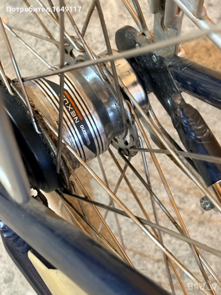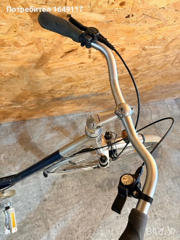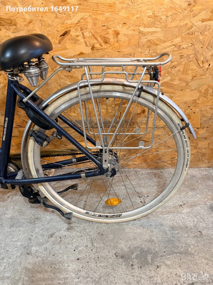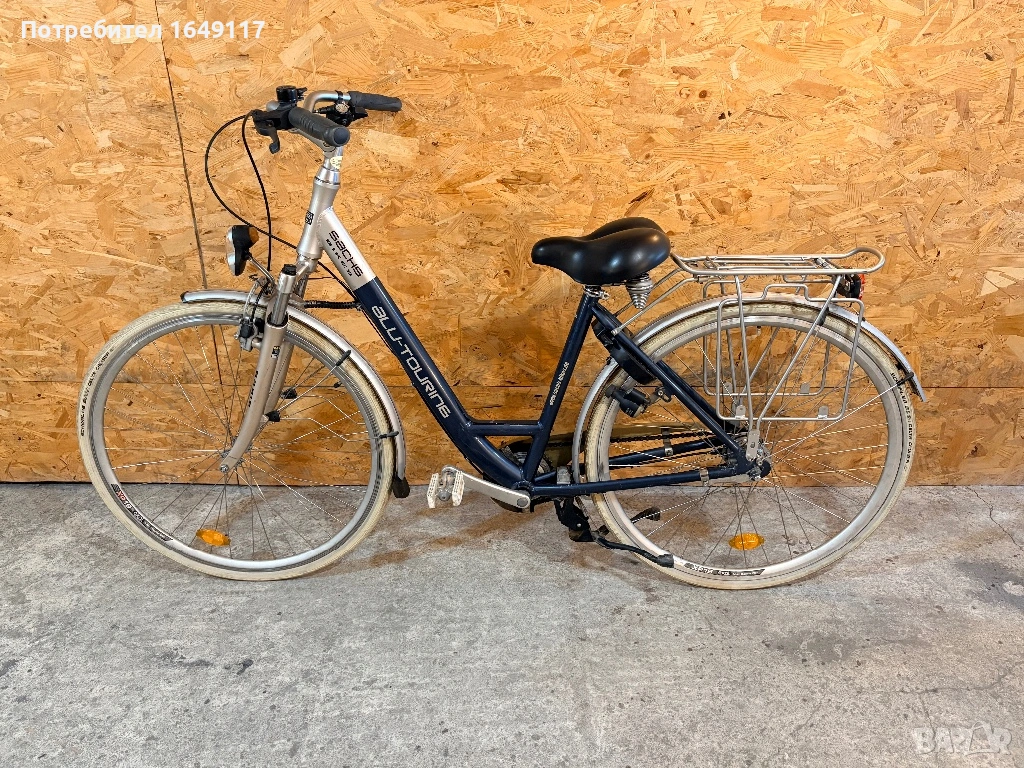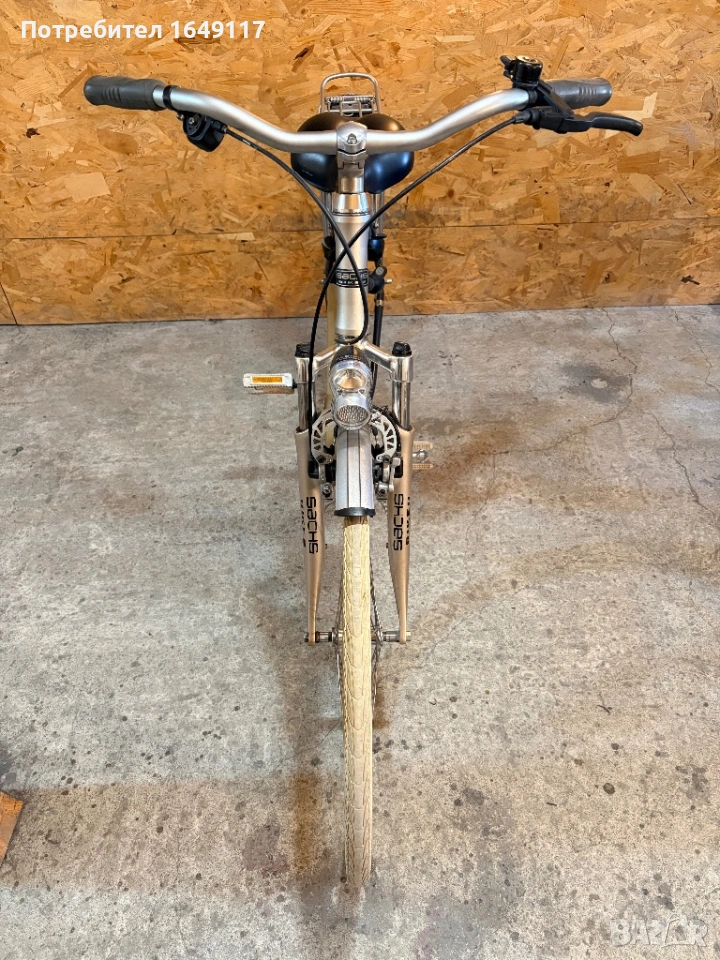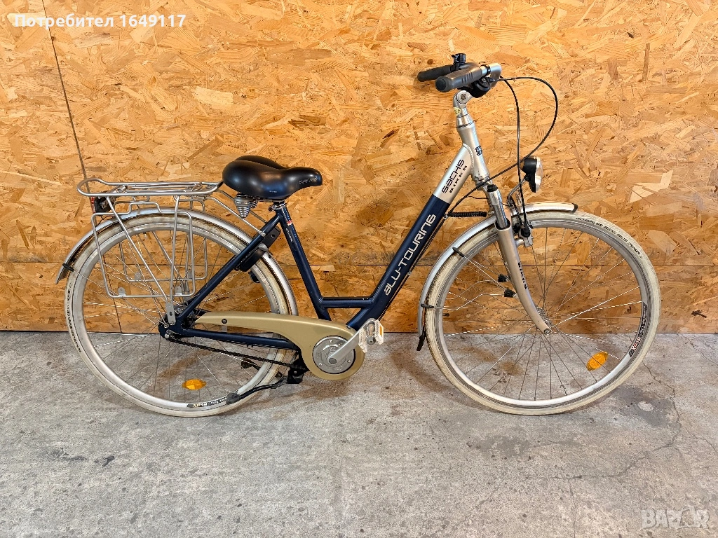 Продавам 28цола, съвсем малко употребяван, дамски-градски велосипед SACHS Alu-Touring[made in Germany]. Олекотена, алуминиева рамка - 48см, с изправен стоеж и ниско прекрачване. Вътрешни скорости Shimano Nexus Inter 7 - 7бр. c палцова командa Shimano. Предна алуминиева-амортисьорна вилка SACHS. Алуминиеви курбели с алуминиеви педали. Широка, ергономична, гел-пружинна седалка Selle Royal Manhattan с алуминиево колче. Алуминиеви, двойностенни-аеро капли EXAL XP19, и нови гуми Schwalbe Delta Cruiser. Предна хидравлична спирачка Magura + контра отзад. Широко алуминиево, градско кормило с алуминиева развижна лапа. Заден багажник с натоварване до 25кг + дисаги Haberland Touring. Олекотени, пластмасови калници SKS. Двойна мото стойка. Диоден фар и диодна габаритна светлина с динамо, светлоотразители, звънец. Фабричен заключващ механизъм AXA с ключ на задната капла