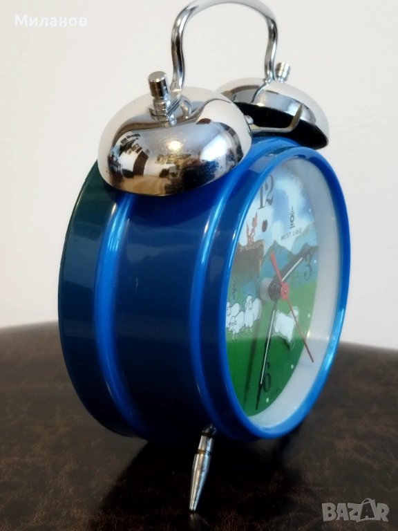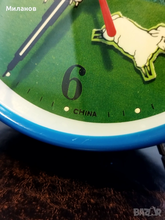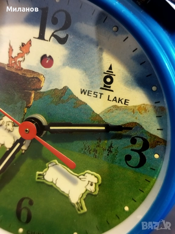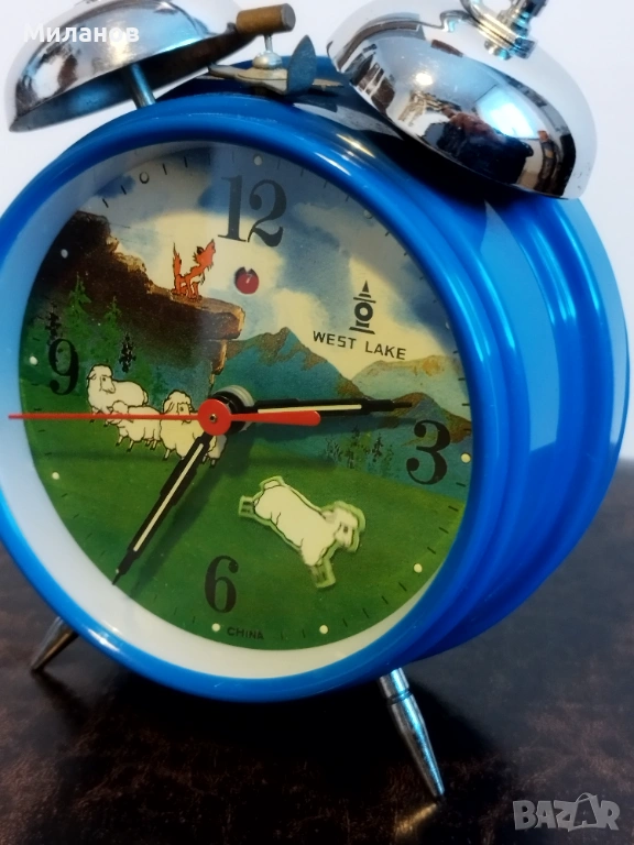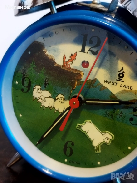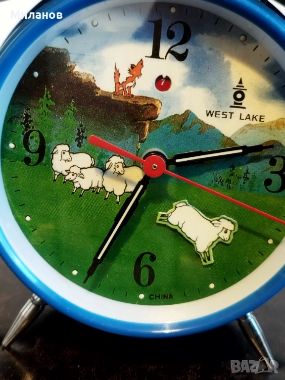 Стар механичен китайски анимиран будилник West lake.Много рядък, в отлично състояние.Работи и звъни.Пластмасов корпус.Агънцето се поклаща.Диаметър-124 милиметра.Номер на часовника112421