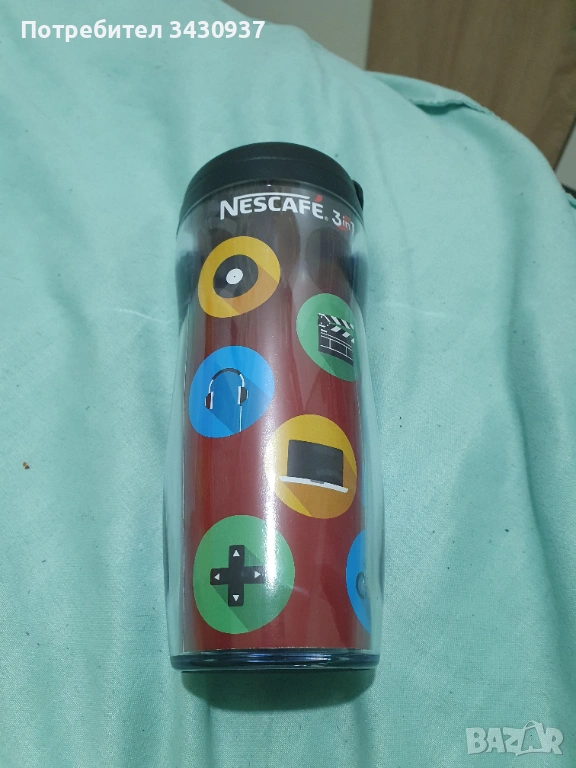 Продавам оригинална термочаша Nescafe 3in1 от лимитирана промоционална серия. Чашата се отличава с модерен дизайн с цветни икони (геймпад, слушалки, кино), което я прави идеален аксесоар за активни хора и любители на кафето.
