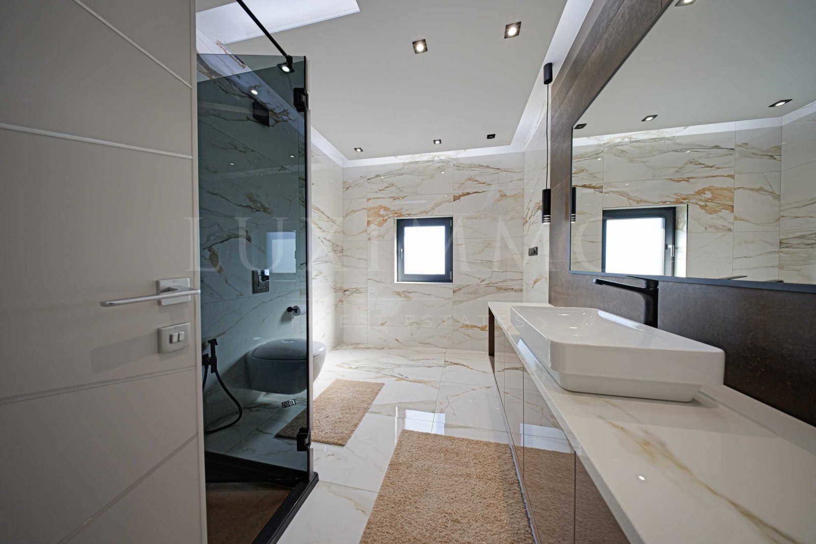 Къщата разполага с разгъната застроена площ от 528 кв.м, функционално разпределени на няколко нива сутерен, приземен етаж, първи етаж и впечатляваща панорамна тераса. Интериорът е допълнен от красиви стълби от естествен камък, които придават елегантност и завършен вид на имота.