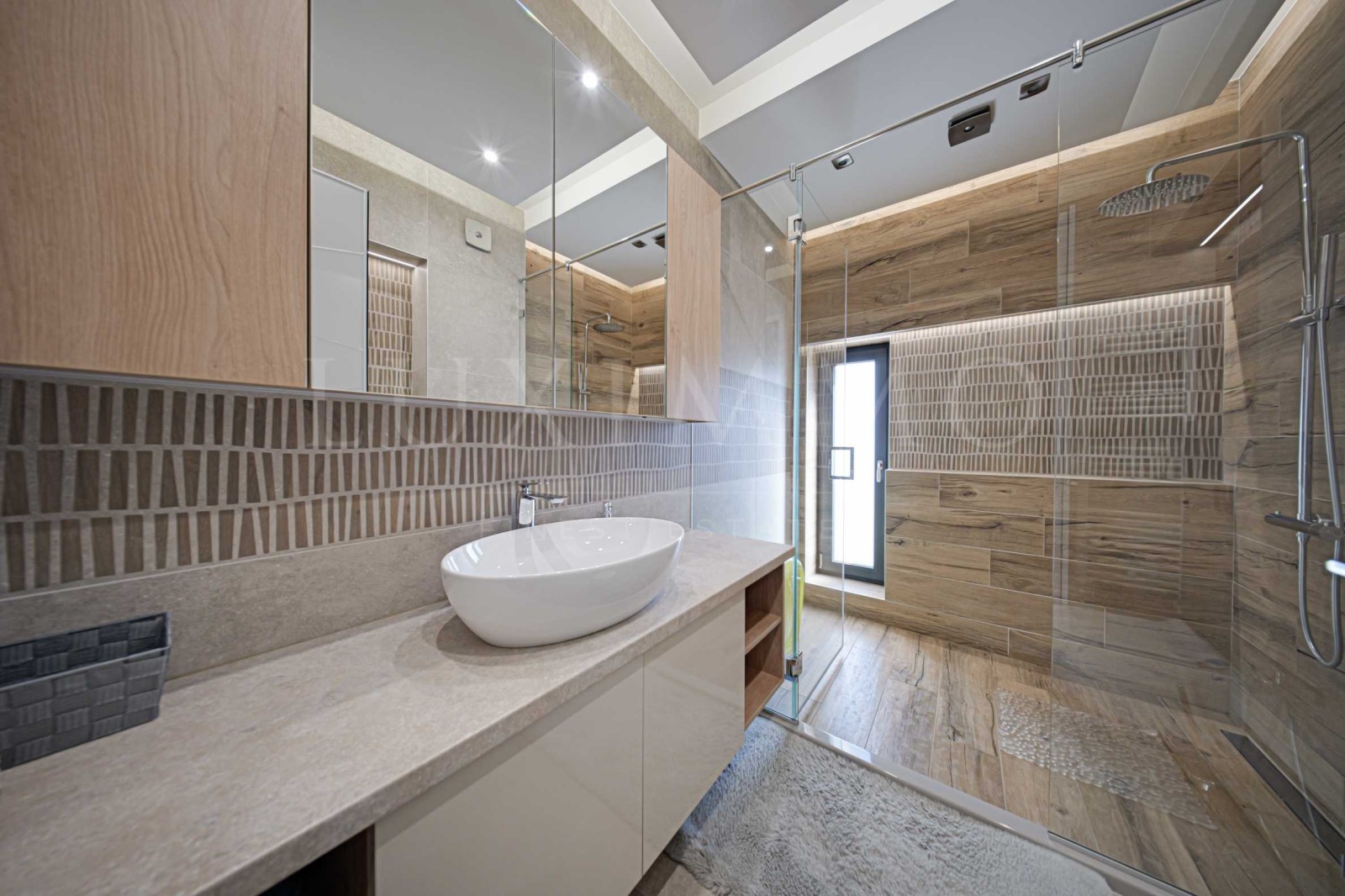 Имотът е изграден с висококачествени материали и съвременни технологии, без компромис в изпълнението. Къщата се предлага напълно обзаведена и готова за нанасяне. Разположена е в парцел с площ 684 кв.м с отлично поддържан и просторен двор.