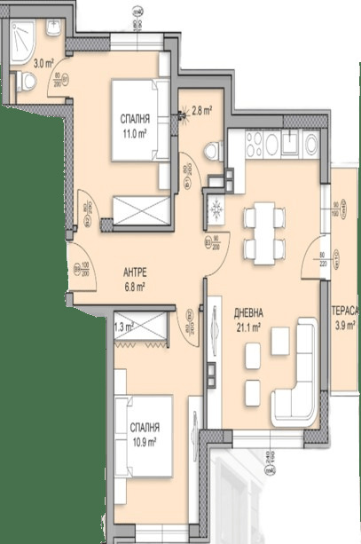 Жилището е функционално проектирано с просторна дневна с тераса, две спални, две санитарни помещения и тристранно изложение (север изток юг), което осигурява естествена светлина през целия ден.