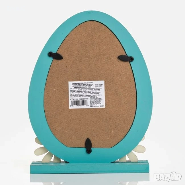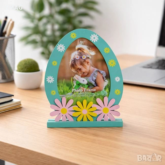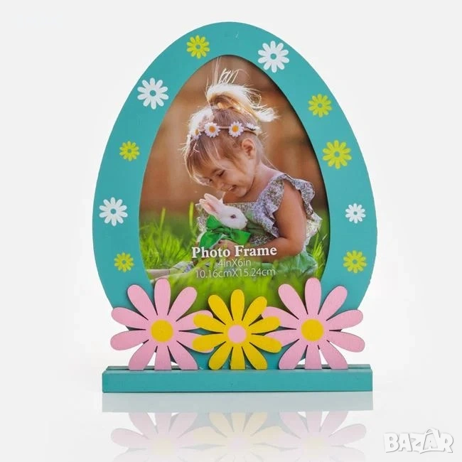 Дървена рамка за снимка във форма на яйце в тюркоазен цвят с правоъгълна основа и декоративни маргаритки. Великденската серия "Постави своята снимка" ви предлага красив начин да представите и запечатите специалните моменти от всеки сезон.