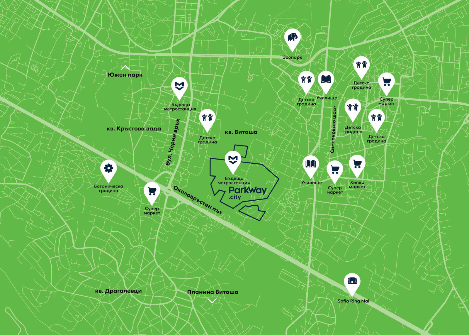 Разположен в престижна локация, ParkWay.city съчетава модерния дизайн и съвременните технологии с дълбоко разбиране за човешките потребности. Това не е просто нов жилищен проект това е пространство, което дава нов смисъл на думата среда . Това е проект, който мисли за всеки детайл от инфраструктурата до обществените пространства, от алеите до парковете и детските площадки, от канализацията, водопроводите, осветлението, улиците, паркоместата до зелените площи. ParkWay.city е място, където не само се изграждат жилищни и търговски обекти, но и истинска инфраструктурна екосистема, която да бъде еталон за устойчиво градско развитие.