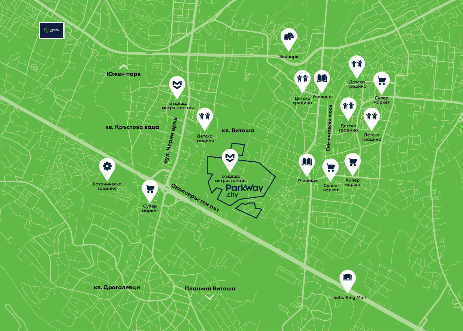Разположен в престижна локация, ParkWay.city съчетава модерния дизайн и съвременните технологии с дълбоко разбиране за човешките потребности. Това не е просто нов жилищен проект това е пространство, което дава нов смисъл на думата среда . Това е проект, който мисли за всеки детайл от инфраструктурата до обществените пространства, от алеите до парковете и детските площадки, от канализацията, водопроводите, осветлението, улиците, паркоместата до зелените площи. ParkWay.city е място, където не само се изграждат жилищни и търговски обекти, но и истинска инфраструктурна екосистема, която да бъде еталон за устойчиво градско развитие.