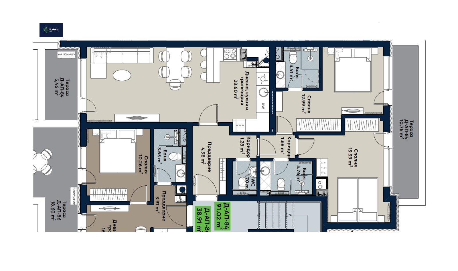 Конкретното предложение е за покупка на тристайно жилище със статут на апартамент на пети етаж, състоящо се от антре, две спални, всекидневна с трапезария, кухненски бокс, мокро помещение, две бани с WC и две тераси. Застроена площ: 101,78кв.м. Изложение: югозапад/североизток.