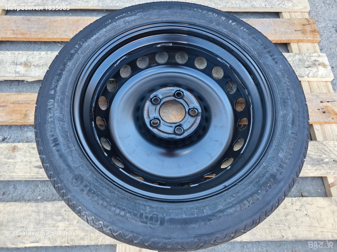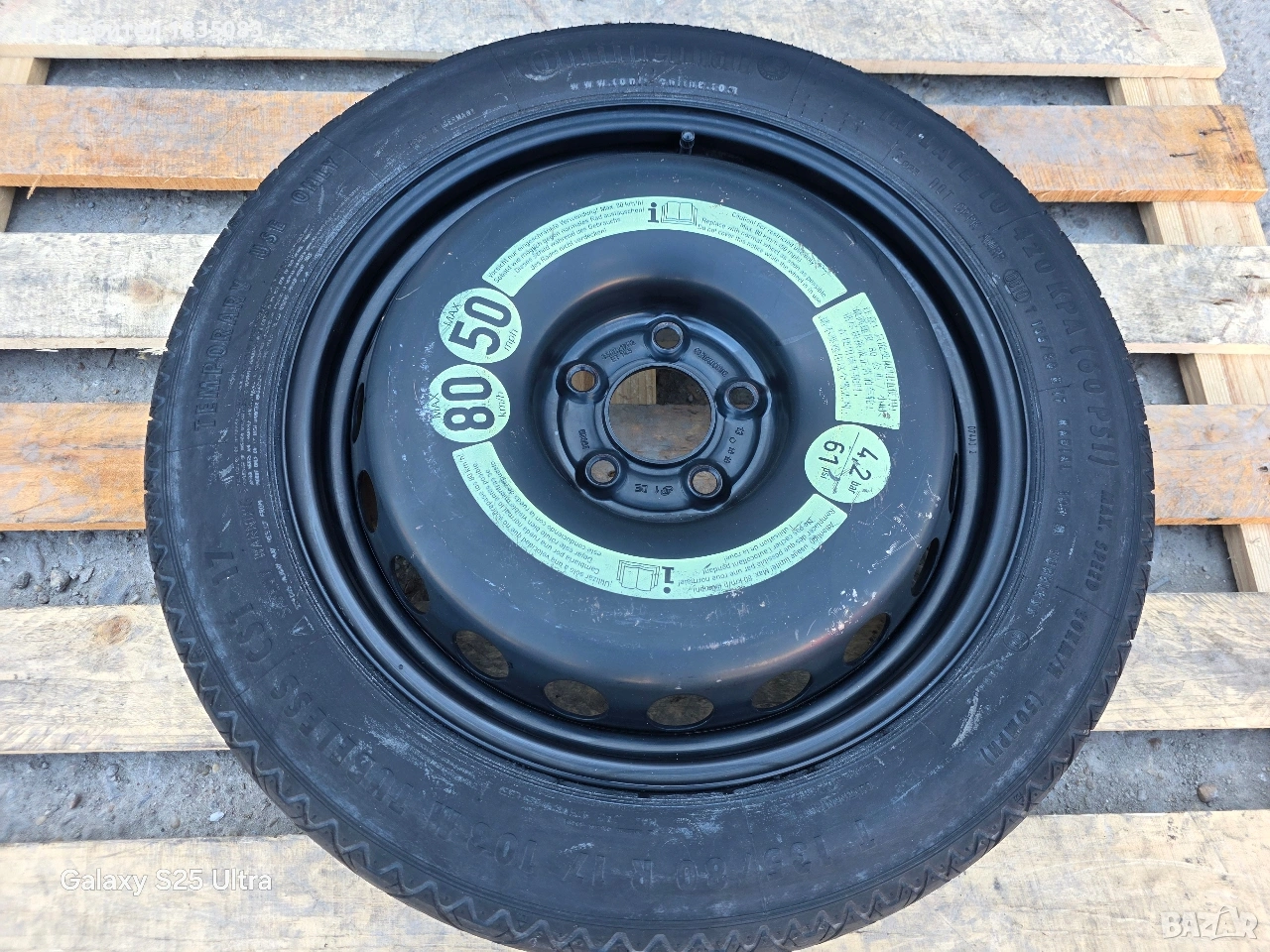 Продавам оригинална резервна гума тип патерица за Мерцедес с размери 17" 5х112 3.5J ET19.5 ЦО66.6мм. с гума Continental 135/80/17.