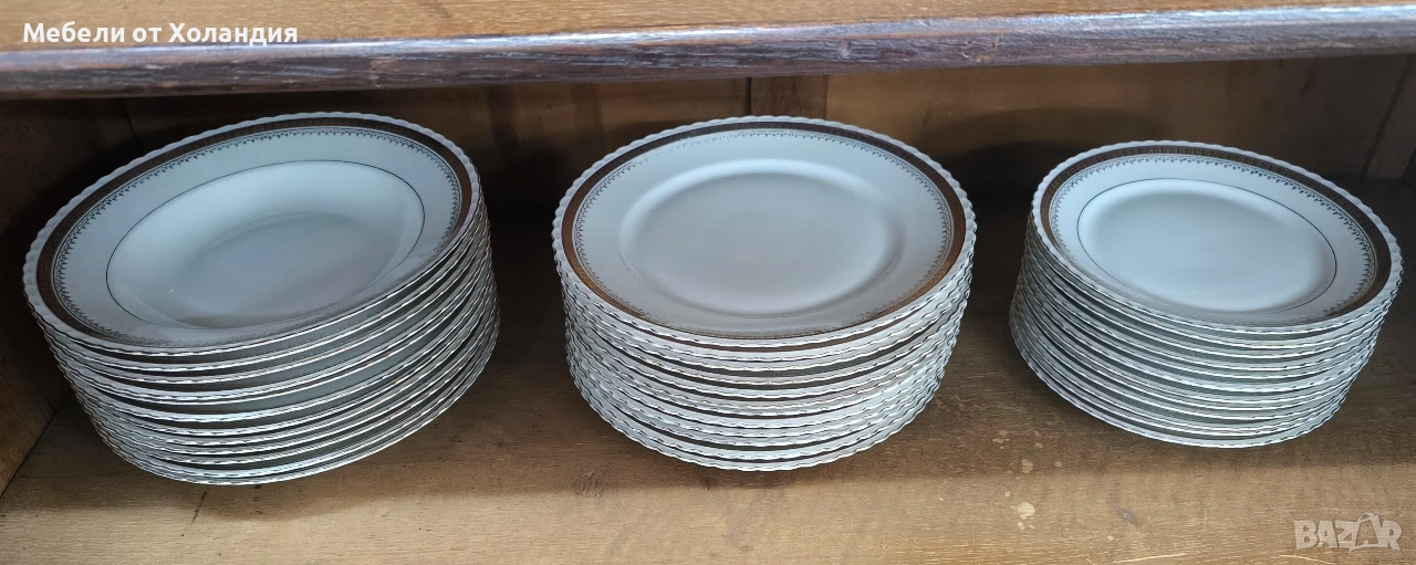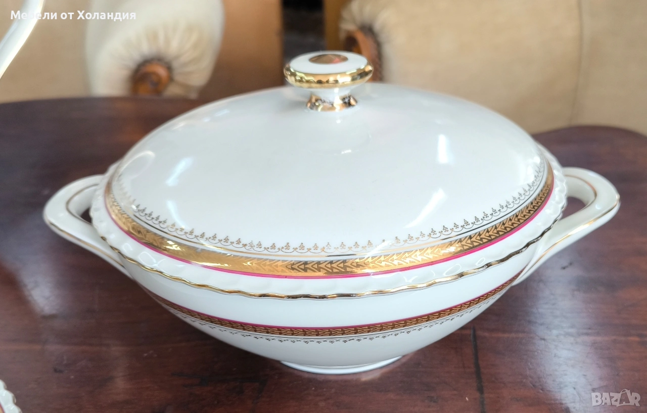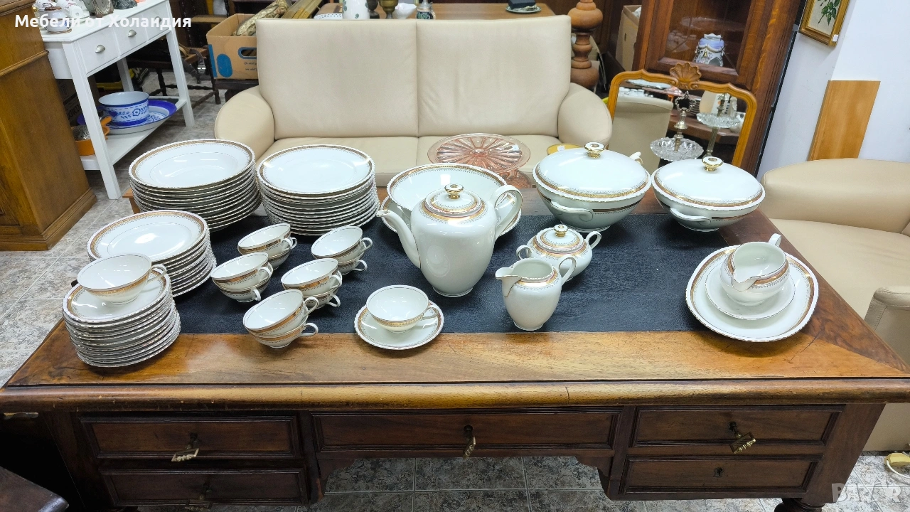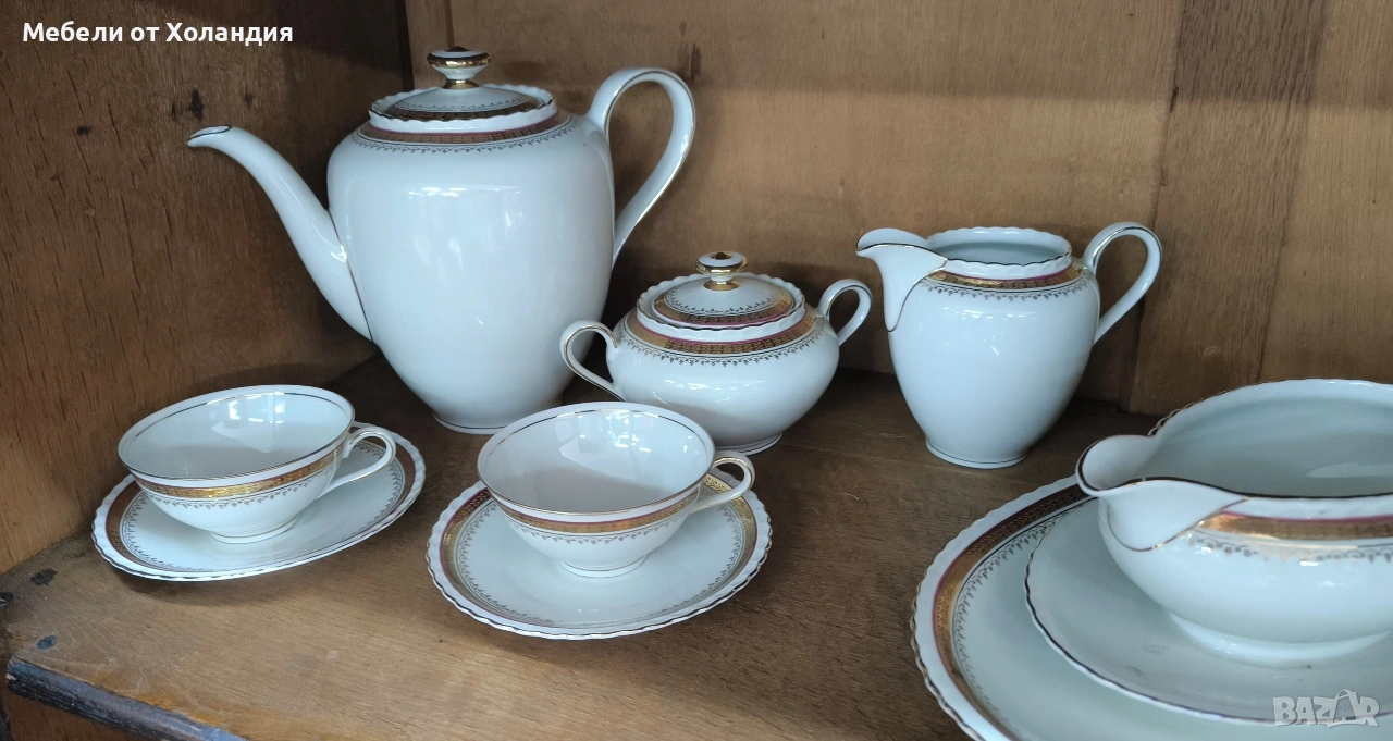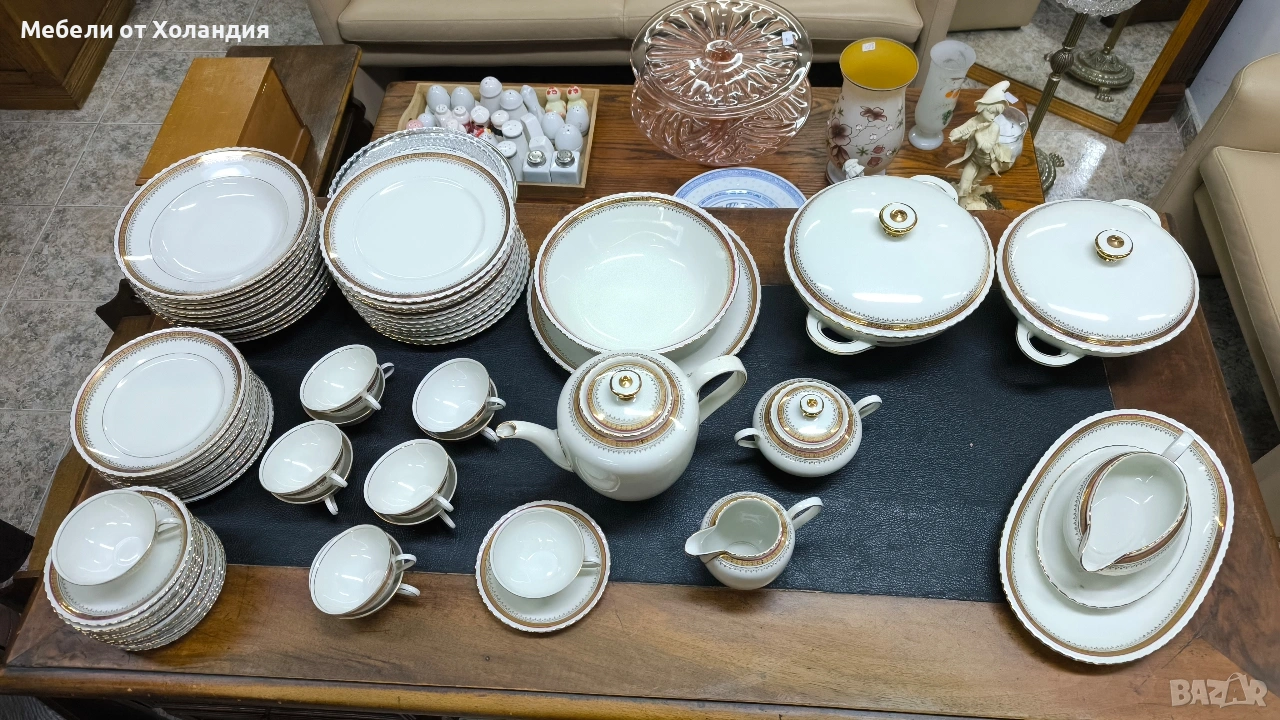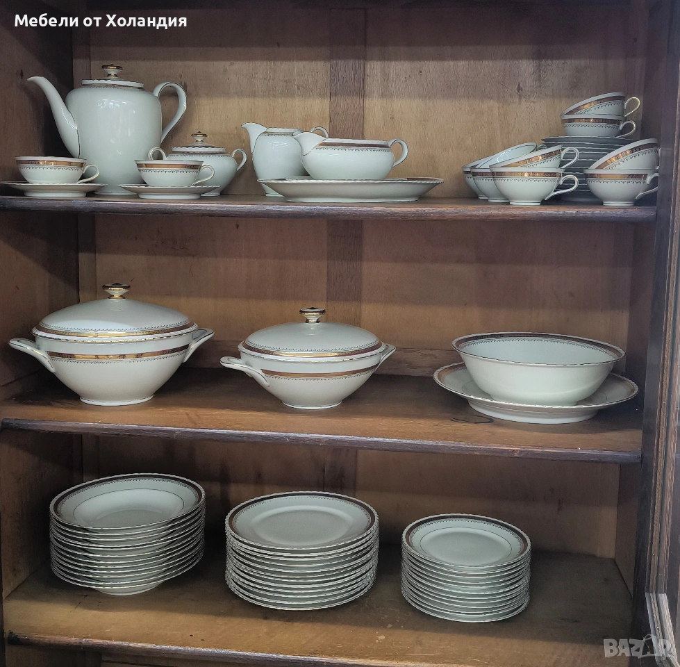 Пълен порцеланов сервиз за 12 души. 12 супени чинии; 12 чинии за основно; 12 десертни чинии; Супник и по-малък съд с капак за сврвиране; сосиера; 2 бр. плата; купа за салата; 12 бр. чашки с чинийки за кафе/чай; захарница; латиера; Чайник. Всичко 73 части. Без чипове.