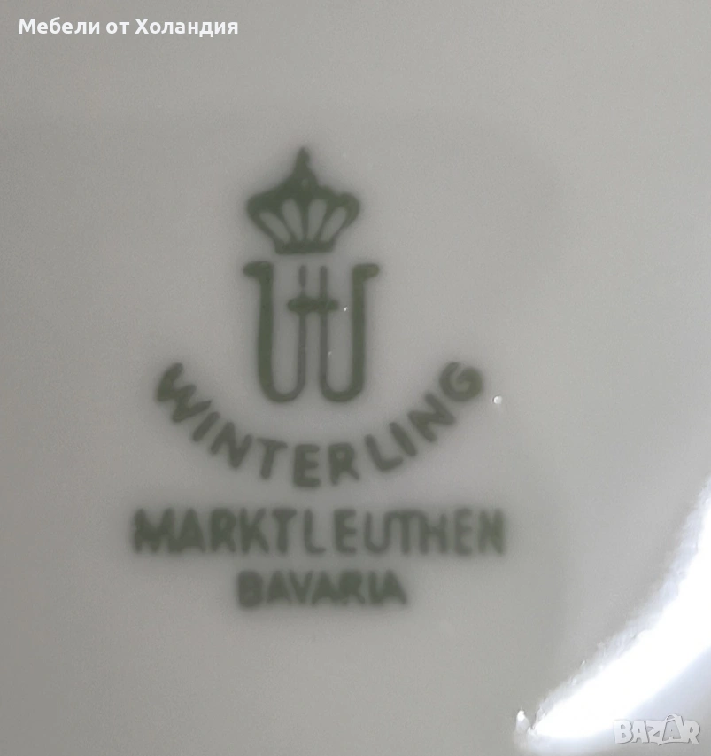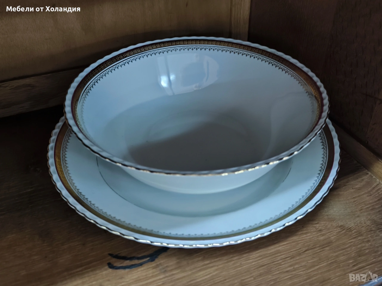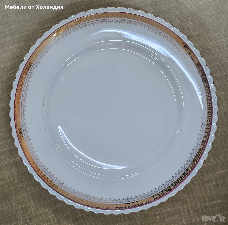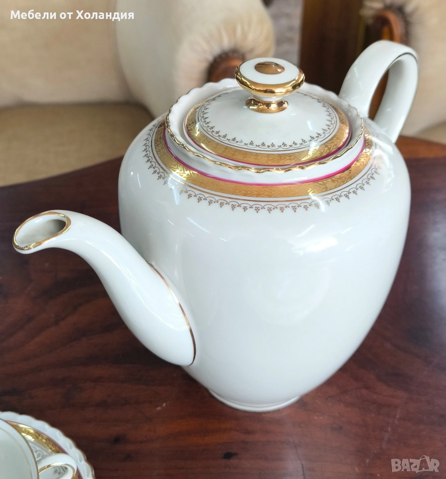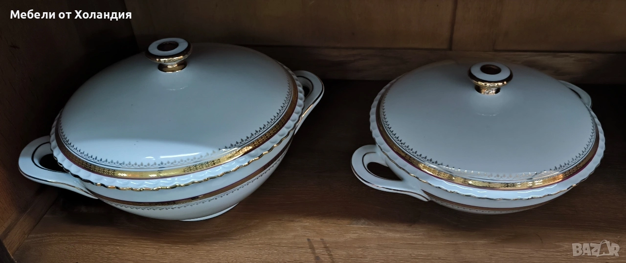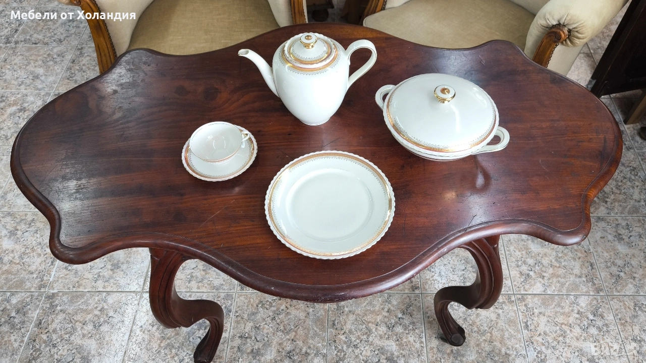Пълен порцеланов сервиз за 12 души. 12 супени чинии; 12 чинии за основно; 12 десертни чинии; Супник и по-малък съд с капак за сврвиране; сосиера; 2 бр. плата; купа за салата; 12 бр. чашки с чинийки за кафе/чай; захарница; латиера; Чайник. Всичко 73 части. Без чипове.