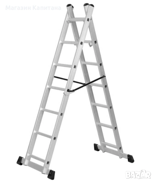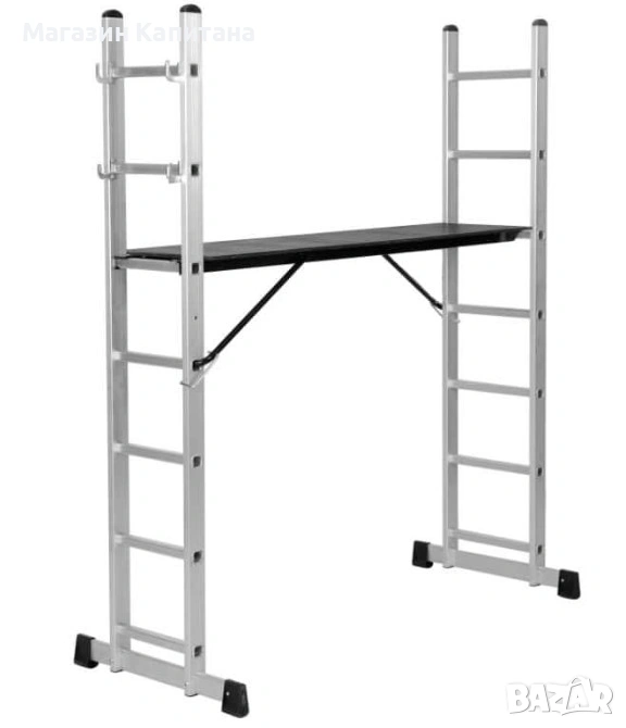 Алуминиева стълба скеле. Състои се от две подпиращи стълби със 7 стъпала и платформа. Възможност за сглобяване на стълбище или прагове.