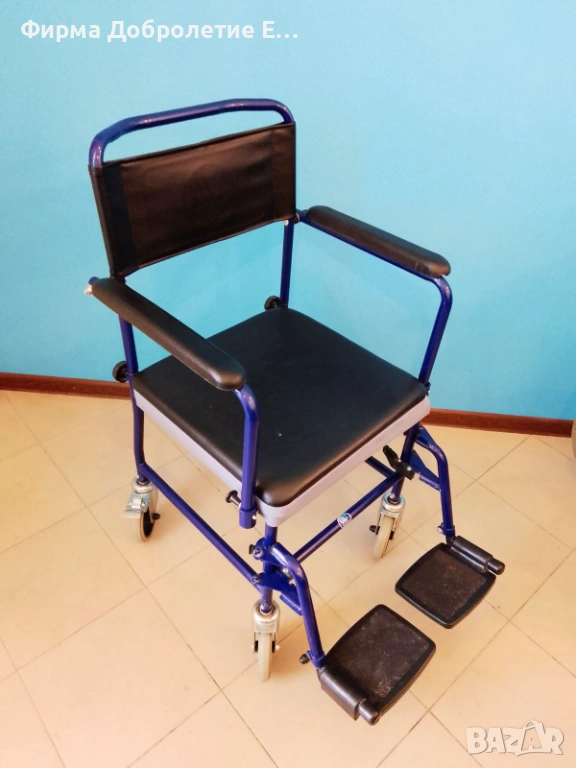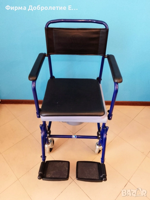 Тоалетният стол със санитарен контейнер на четири колела е оборудван с подвижни подложки за крачета и легнали подлакътници и възглавница за седалки.