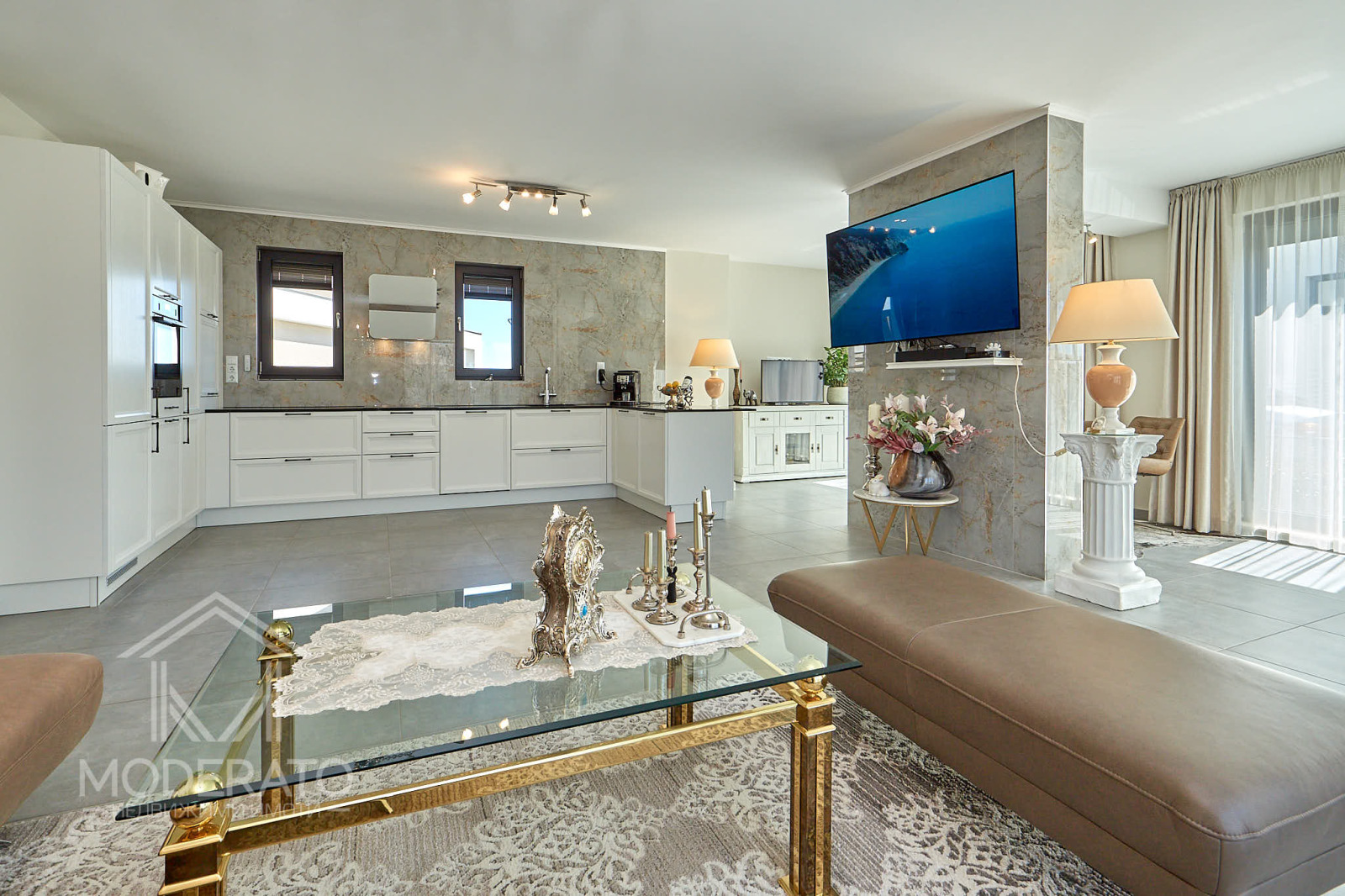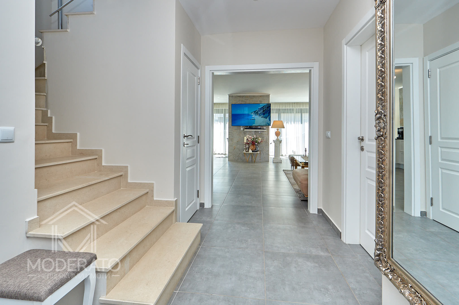 Имотът е напълно обзаведен. Тук ще се радвате на топли цветове и уютна обстановка с архитектура на италиански стил. Всекидневната предлага приятна зона за отдих с удобен голям и функционален диван, декоративни елементи от Marioni и голям телевизор. Италянска кухня е от масивно дърво с плот от черен гранит, напълно оборудван, със съдомиялна BOSCH, сместител Hansgrohe, електрическа система за филтриране от немско производство Falmec.