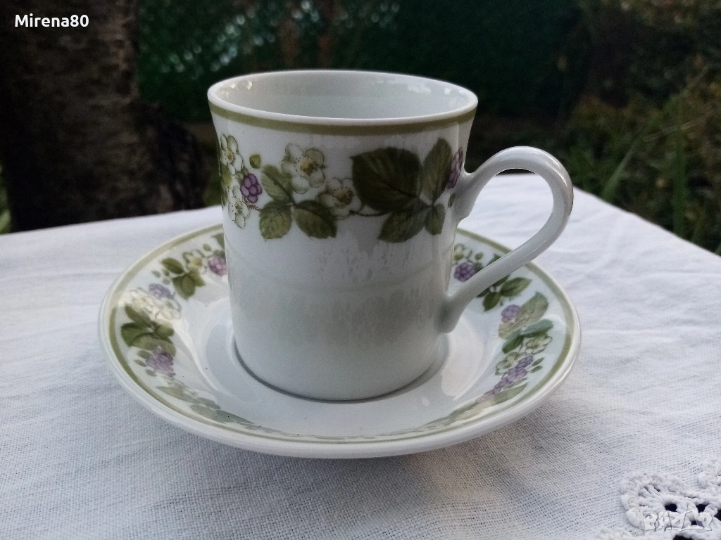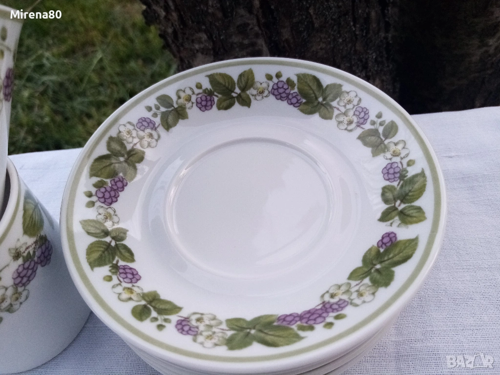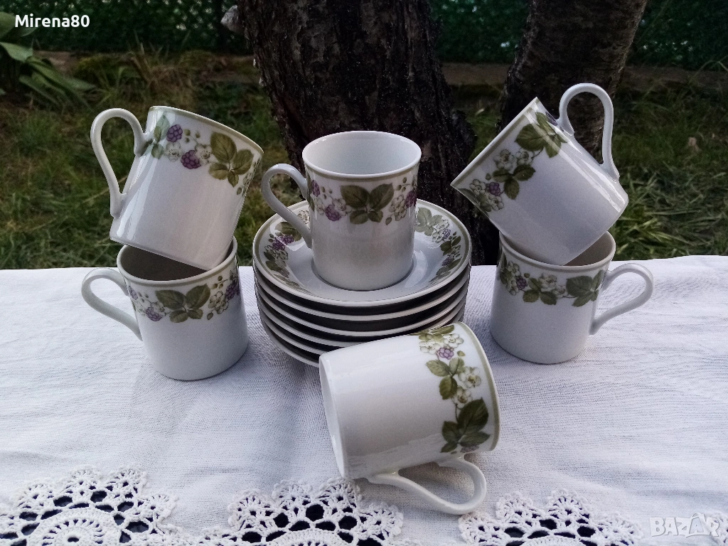 Много красиви 6 бр. сета за кафе - 120 мл до ръб. Класическа форма, удобна дръжка, разкошен плодов декор (къпинки) върху снежнобял фин порцелан. Зелен кант - може да се ползват и в микровълнова, и в съдомиялна. Отлично състояние !