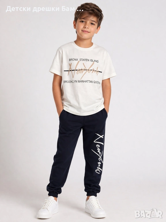 Модерен и удобен детски комплект за момче от две части – тениска и дълъг спортен панталон.