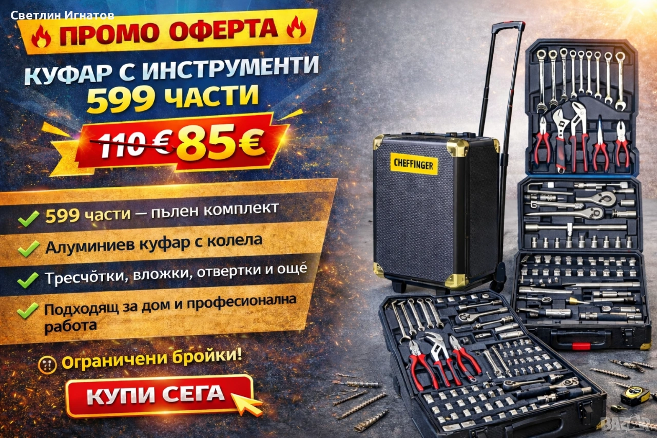 Предлагаме пълен комплект инструменти Cheffinger – 599 части, събран в удобен алуминиев куфар с колела и телескопична дръжка. Идеален както за домашна употреба, така и за професионалисти.