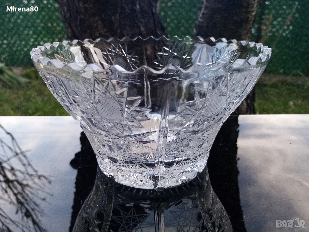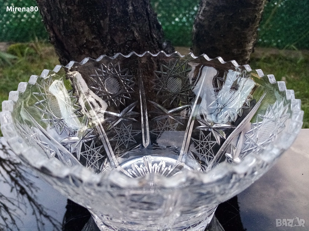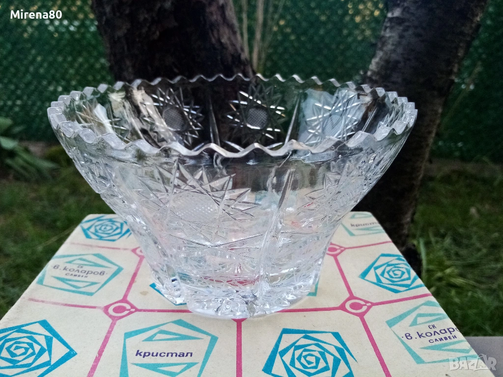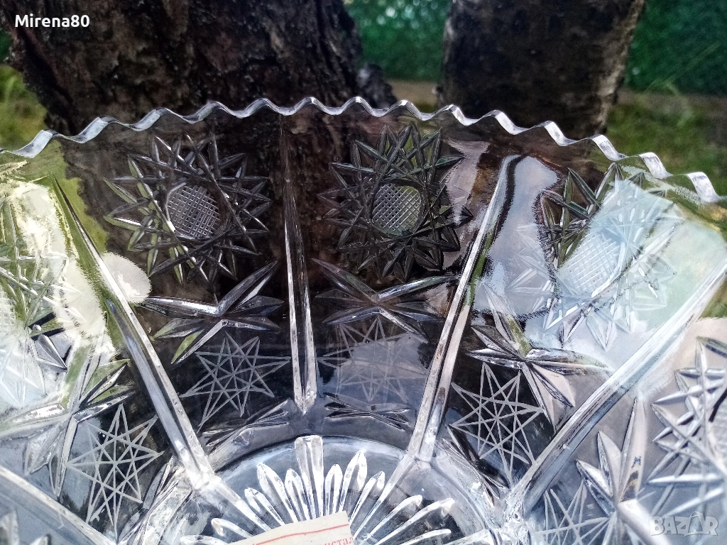 Сливенски оловен кристал - купа за плодове или бонбонки. По етикет е фруктиера. Много красива - с рязан ръб и изключително богата гравюра пентаграм - подобна на бохемския кристал. Диам. 16, вис. 9.5 см. С оригинална кутия и етикет - подходяща и за подарък !
