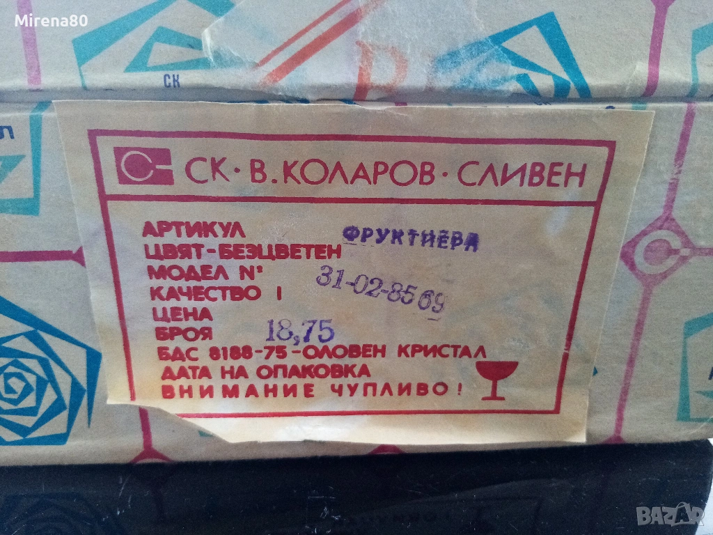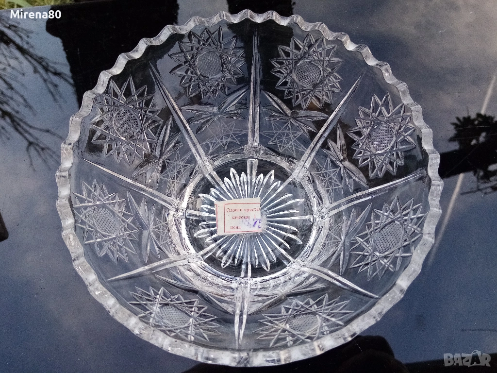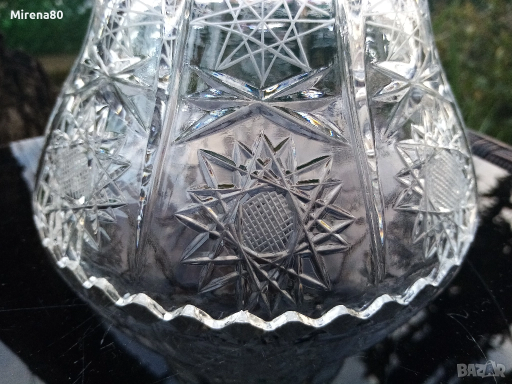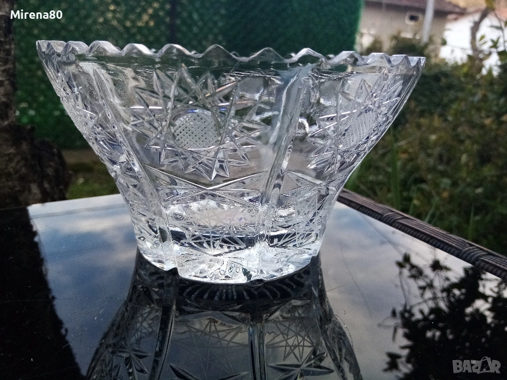 Сливенски оловен кристал - купа за плодове или бонбонки. По етикет е фруктиера. Много красива - с рязан ръб и изключително богата гравюра пентаграм - подобна на бохемския кристал. Диам. 16, вис. 9.5 см. С оригинална кутия и етикет - подходяща и за подарък !