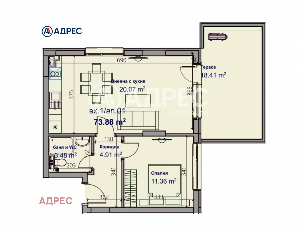 АДРЕС предлага уютен двустаен апартамент с източно изложение в модерна и емблематична за региона сграда. Този дом се състои от хол с кухненски бокс, спалня, санитарен възел и голяма тераса.