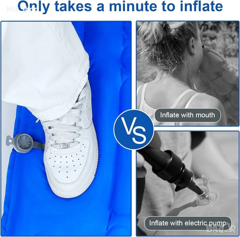 1 минута бързо надуване и изпускане - Без повече надуване с ръка, уста или помпа, спестявайки време и усилия. Прокарайте крака си върху вградената въздушна помпа, докато се напълни с въздух, до 1 минута! Забележка: дизайн с двоен клапан, дренажният клапан на къмпинг матрака трябва да бъде затворен при надуване.