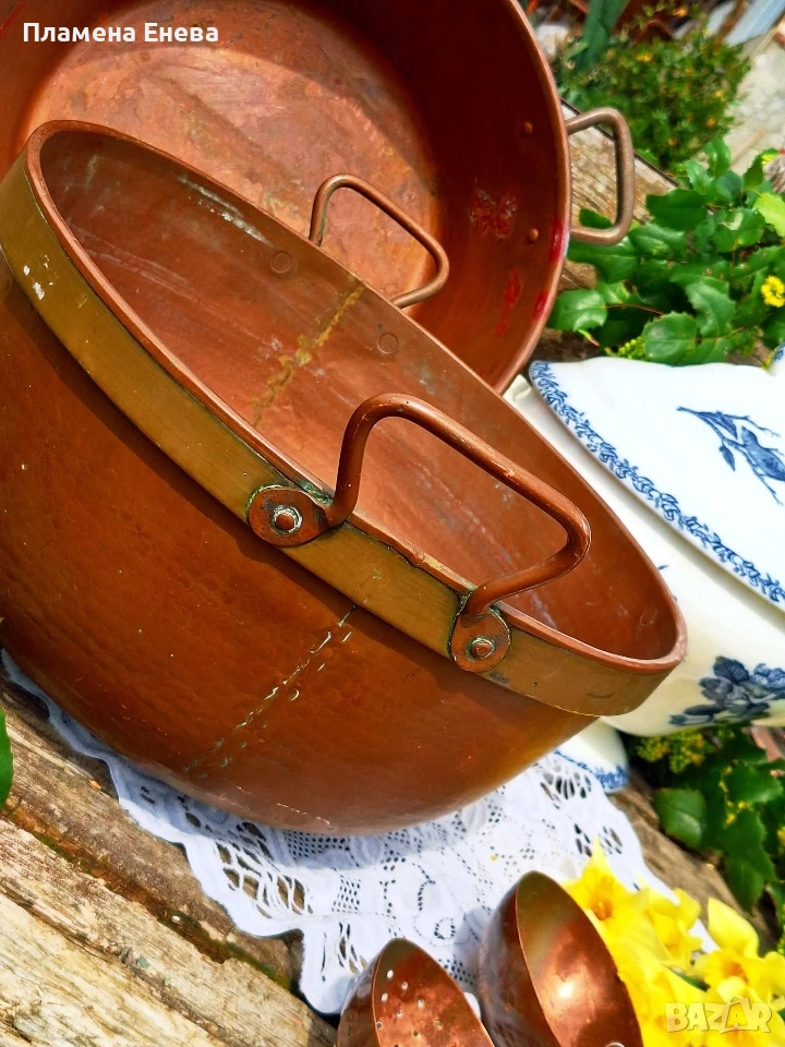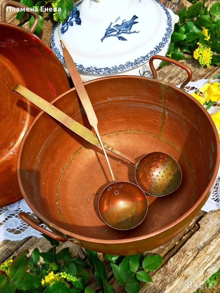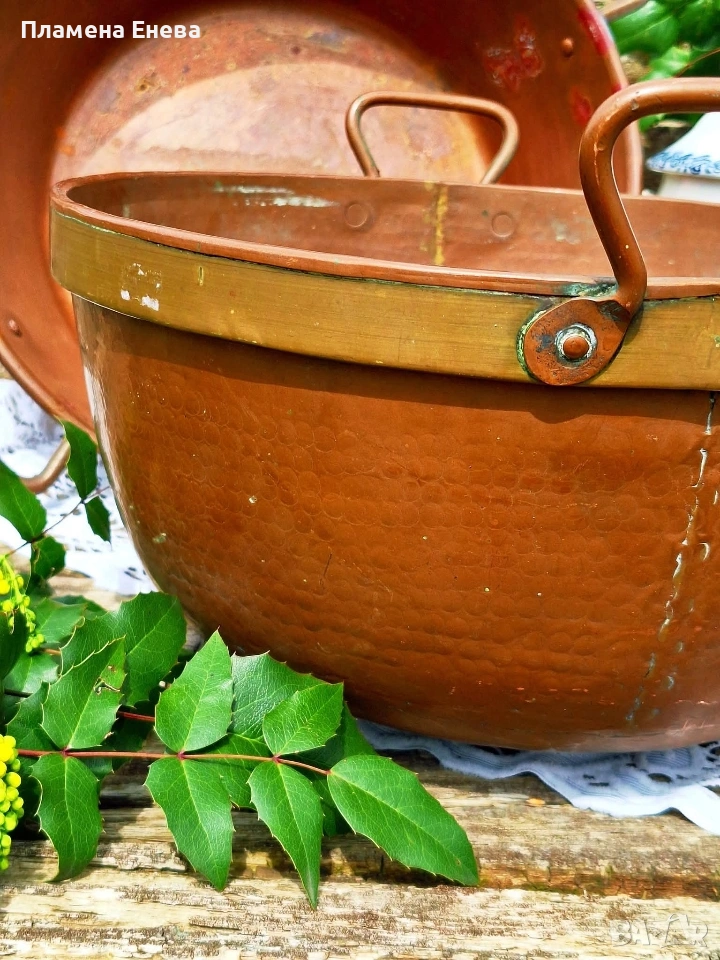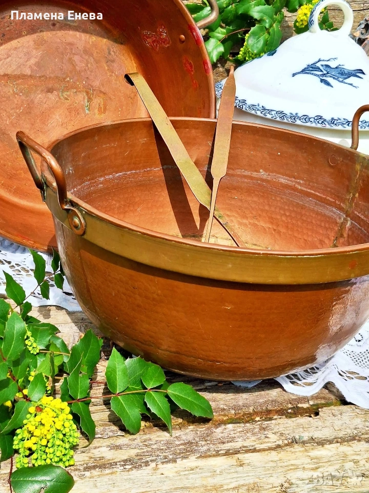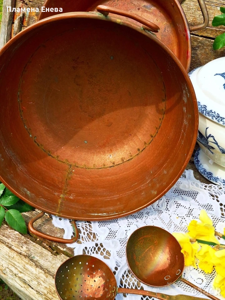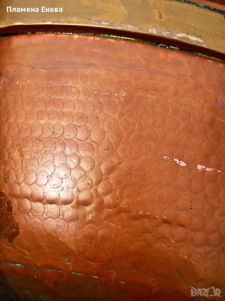 Голяма, масивна медна тава, която не се среща всеки ден. Плътна мед, солиден месингов обрач и онова усещане, че ще остане за идните поколения.