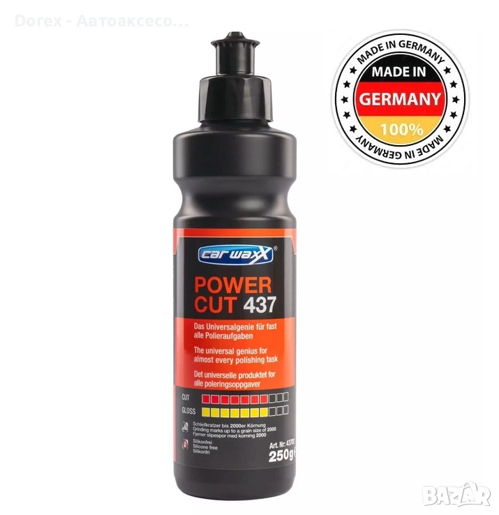 Power Cut 437 е универсална и високоефективна полираща паста, предназначена за бързо и трайно премахване на следи от шлифоване, фини драскотини, холограми и ивици. Създадена за професионална употреба, тази паста комбинира силно абразивно действие с лесна обработка, осигурявайки идеално гладки и блестящи повърхности.
