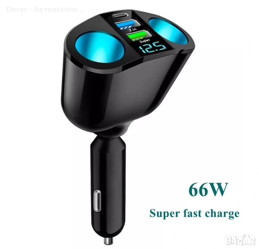 Практичен автомобилен аксесоар, който комбинира бързо зареждане на устройства и мониторинг на напрежението на акумулатора.