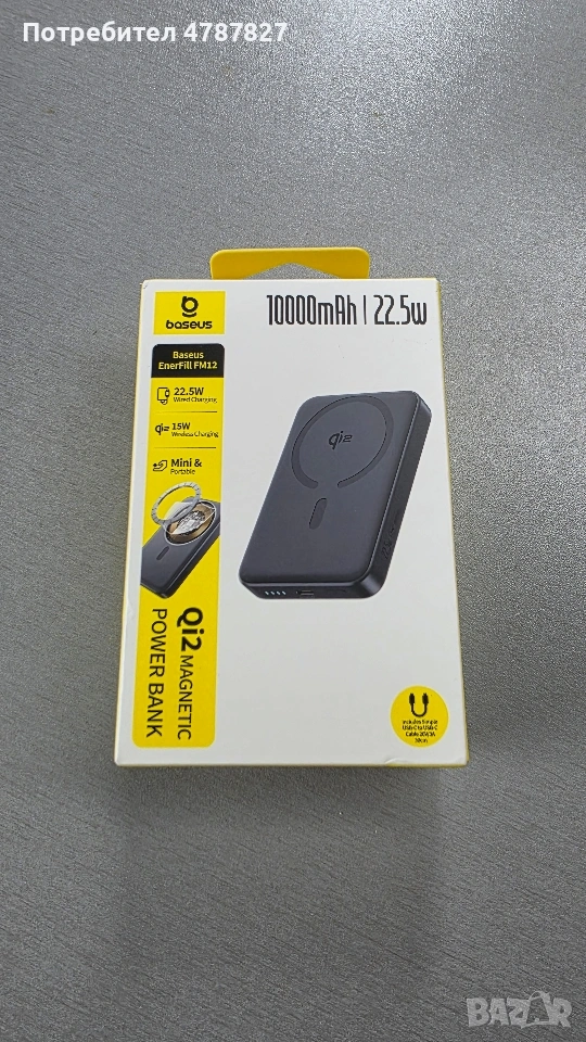 Продавам външна батерия Baseus EnerFill FM12 с капацитет 10000mAh. Устройството е компактно, удобно за носене и подходящо за ежедневна употреба. Капацитет: 10000mAh Бързо жично зареждане до 22.5W Безжично зареждане (Qi2) до 15W Магнитно закрепване (подходящо за iPhone и други съвместими устройства) Компактен и лек дизайн Включен USB-C кабел Батерията е нова, в оригинална опаковка, не е използвана. Подходяща за телефон, слушалки и други устройства. Възможно лично предаване или изпращане с куриер.