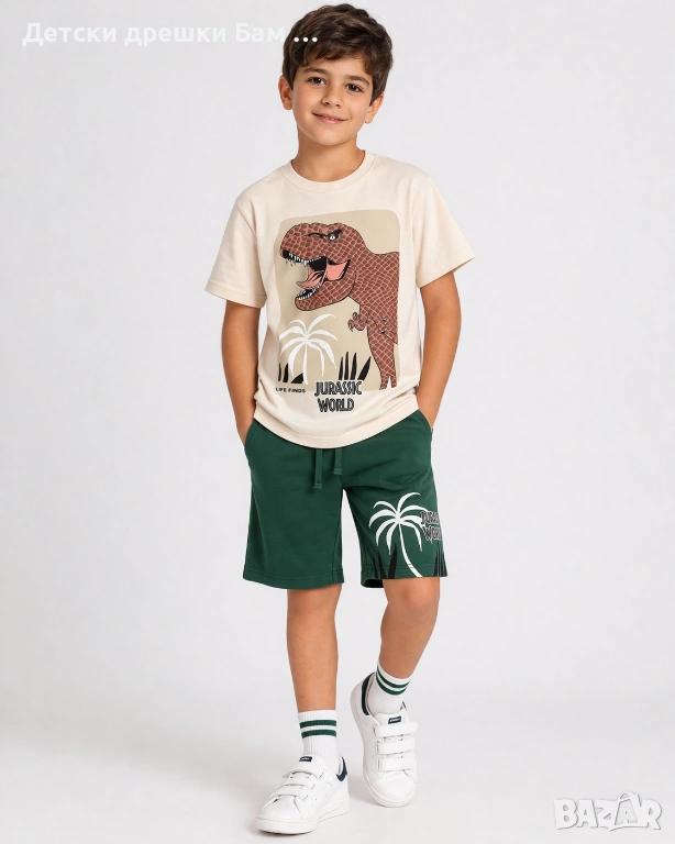 Стилен и удобен детски комплект за момче с дизайн на динозавър. Комплектът включва тениска с принт и къси панталони, изработени от 100% памук, мек и удобен за детската кожа.