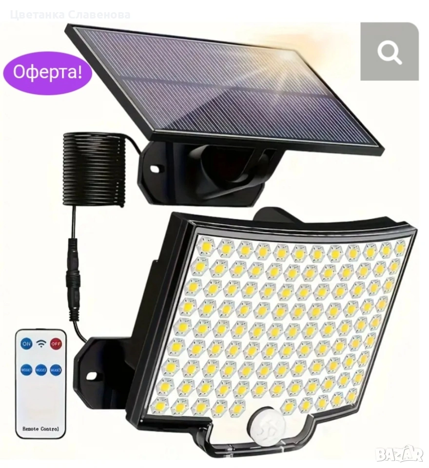 Мощен соларен прожектор с включен соларен панел и кабел – осигурява ярко и ефективно осветление за двор, градина, гараж или алеи. Работи на соларно захранване с вградена литиева батерия, водоустойчив е и се монтира лесно. Идеален за осветяване на открити пространства без нужда от електрическа мрежа.