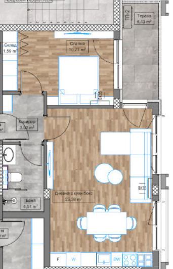 Апартаментът е ситуиран на 3-ти жилищен етаж и разполага с площ от 70 кв.м., разгърната по следния практичен начин: Входно антре, хол с кухня, спалня, тераса и баня с тоалетна.