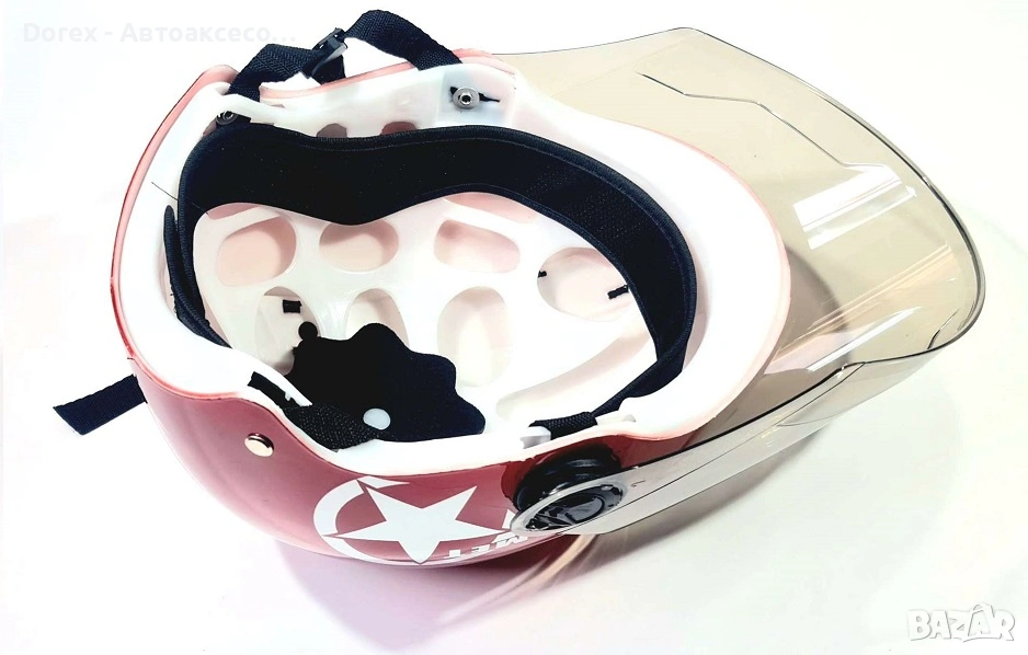 Каската разполага с прозрачен визьор, който предпазва лицето от вятър, прах, насекоми и други външни влияния по време на движение.
