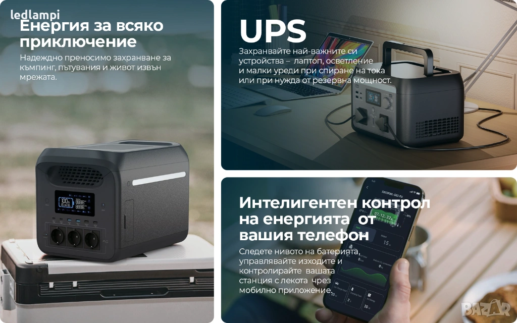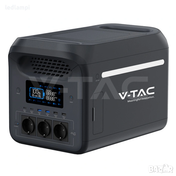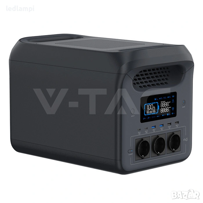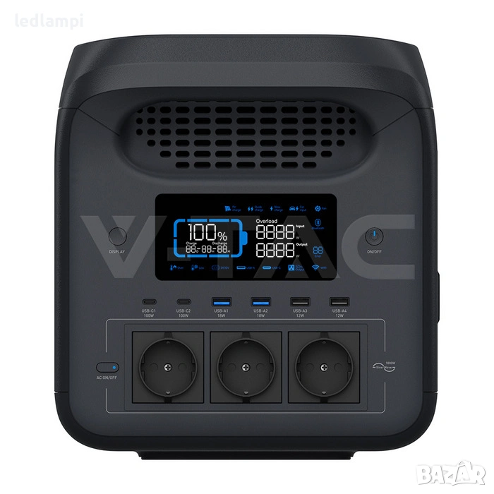 AC изход x 3 (инверторен режим): Чиста синусоида, общо 1800W (пик 3000W), 220–240V~, 50/60Hz, 12A