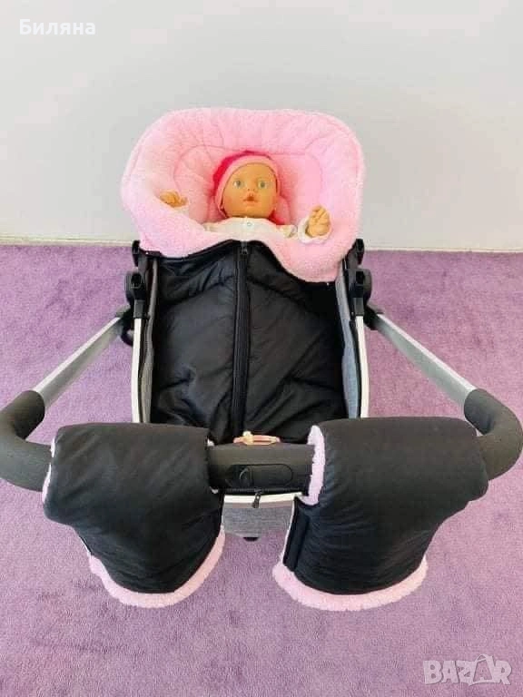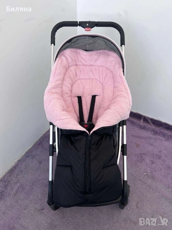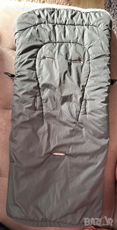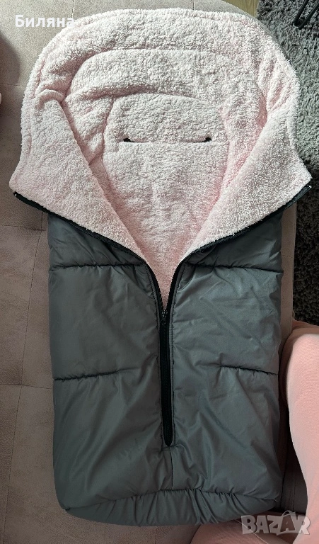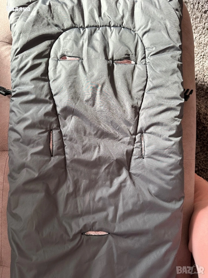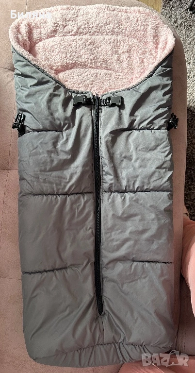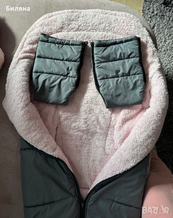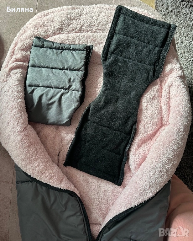 Зимен спален чувал за количка в тъмно сиво с розова вата с дебелина около 3 см, изцяло затворен отдолу. Дължината е 90 см.,което го прави подходящ за ползване много дълго време. Правен е по поръчка, ползван, но доста запазен и без забележки. С прорези за коланите за летния кош - прорезите са стандартни за петточков колан ( горните се отделят от страничните ) Моделът НЕ Е ПОДХОДЯЩ за коланите на колички Cybex. За зимния кош се ползва без колани, малко по дълъг е моделът за зимния кош - нашият беше 70 см , но аз лично леко подгъвах чувалчето отдолу. Топли и е комфортно за бебето/детето в зимни условия. Горната сива част е от материя която не пропуска вода и това запазва детето сухо и затоплено отдолу дори при дъжд или снеговалеж ( изпитано е).Ръкавиците са в същото сиво като чувала, но отвътре са с черен полар, захващат се за дръжката с велкро лепенки от двете страни. Много полезен аксесоар за майката през студените дни. Последните две снимки са примерни на същото чувалче но в черен цвят за по-добра представа как стоят чувалчето и ръкавиците върху зимния и летния кош. Всичко може да се пере в пералня и да се суши в сушилня без проблем. ПОДАРЪК- подложка за летен кош отново в розово и сиво.