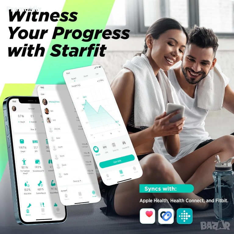 Smart кантара работи с безплатното приложение Starfit, чрез което ще следите всички данни за всяко измерване, което е особено подходящо за жора спазващи диета и режим на хранене.