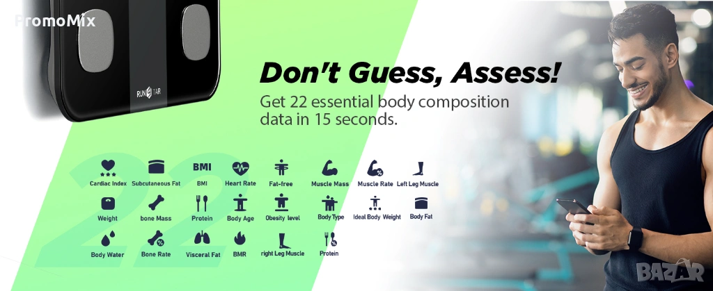 RunStar е кантар анализатор, с който може да измервате 22 основни телесни показателя, като телесно тегло, индекса на телесни мазнини, процент вода в тялото, пулс и др.