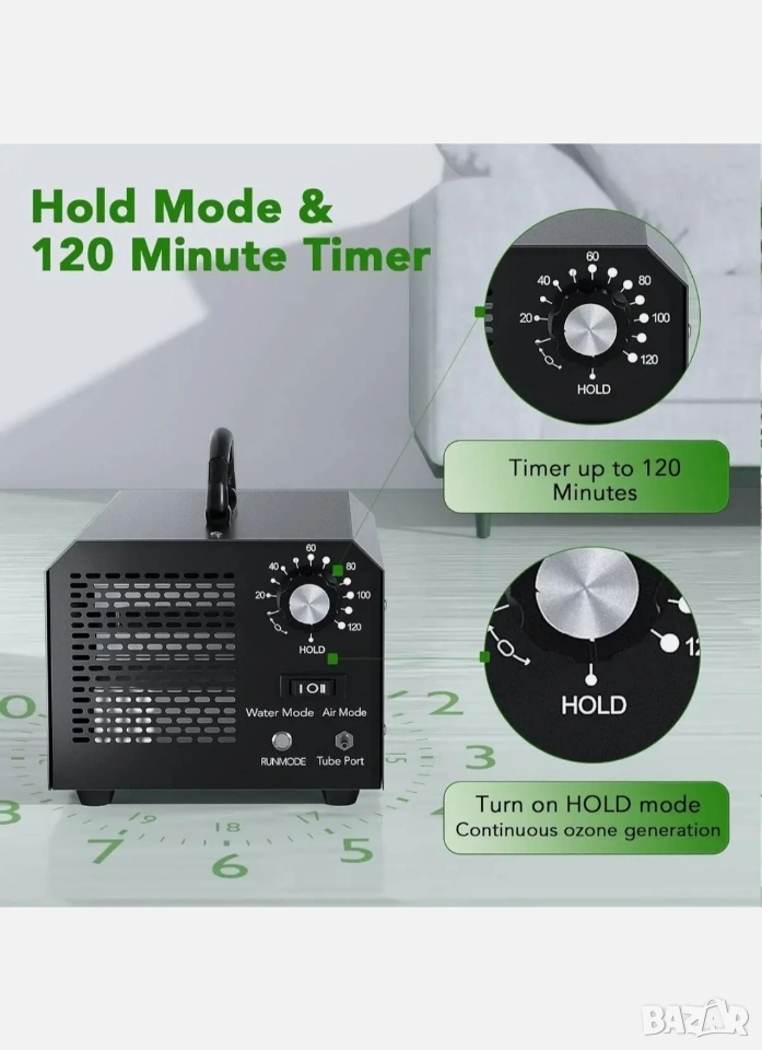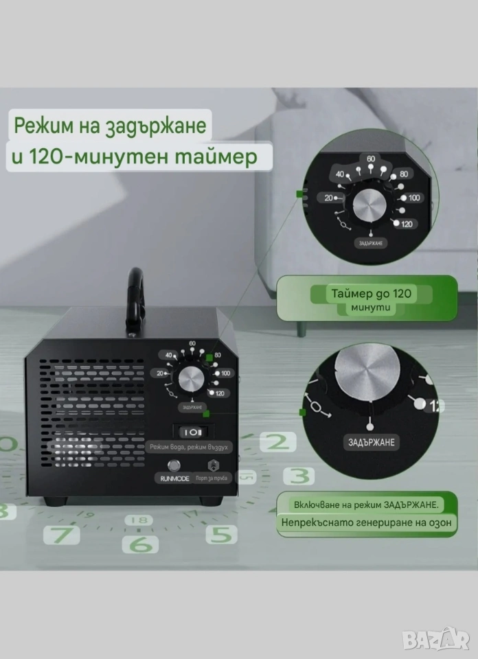 Режим на таймер: Можете да зададете работното време, озоновият генератор ще работи според зададеното от вас време.