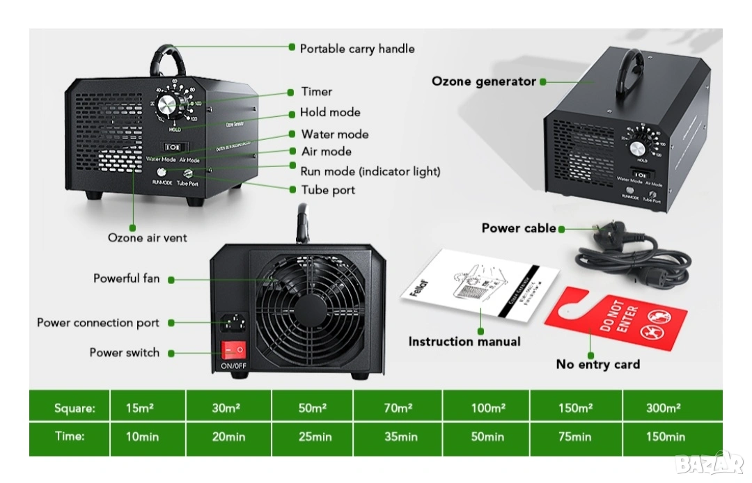 РЕЖИМ ВЪЗДУХ И РЕЖИМ ВОДА: Професионален озонов генератор с два режима. Режимът въздух се използва за пречистване на въздуха в помещения, като спални, мазета, кухни и хотели. Режимът вода използва въздуховоди за генериране на озон в малки зони, като гардероби, шкафове, а също така може да дезинфекцира плодове, зеленчуци и вода.